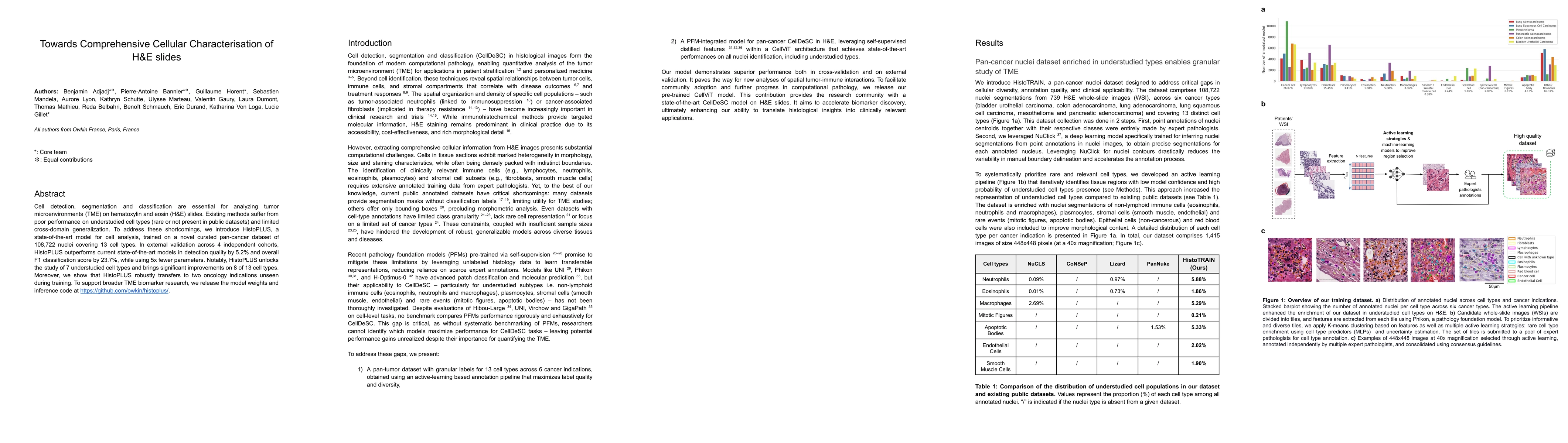 Cell detection, segmentation and classification are essential for analyzing tumor microenvironments (TME) on hematoxylin and eosin (H&E) slides. Existing methods suffer from poor performance on understudied cell types (rare or not present in public datasets) and limited cross-domain generalization. To address these shortcomings, we introduce HistoPLUS, a state-of-the-art model for cell analysis, trained on a novel curated pan-cancer dataset of 108,722 nuclei covering 13 cell types. In external validation across 4 independent cohorts, HistoPLUS outperforms current state-of-the-art models in detection quality by 5.2% and overall F1 classification score by 23.7%, while using 5x fewer parameters. Notably, HistoPLUS unlocks the study of 7 understudied cell types and brings significant improvements on 8 of 13 cell types. Moreover, we show that HistoPLUS robustly transfers to two oncology indications unseen during training. To support broader TME biomarker research, we release the model weights and inference code at https://github.com/owkin/histoplus/.