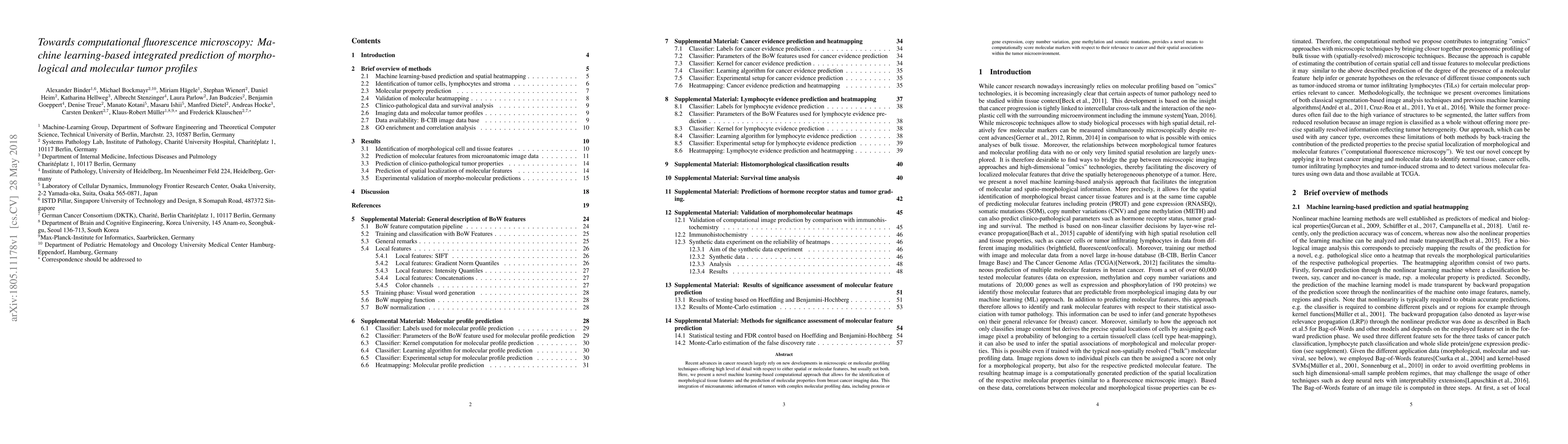 Recent advances in cancer research largely rely on new developments in microscopic or molecular profiling techniques offering high level of detail with respect to either spatial or molecular features, but usually not both. Here, we present a novel machine learning-based computational approach that allows for the identification of morphological tissue features and the prediction of molecular properties from breast cancer imaging data. This integration of microanatomic information of tumors with complex molecular profiling data, including protein or gene expression, copy number variation, gene methylation and somatic mutations, provides a novel means to computationally score molecular markers with respect to their relevance to cancer and their spatial associations within the tumor microenvironment.