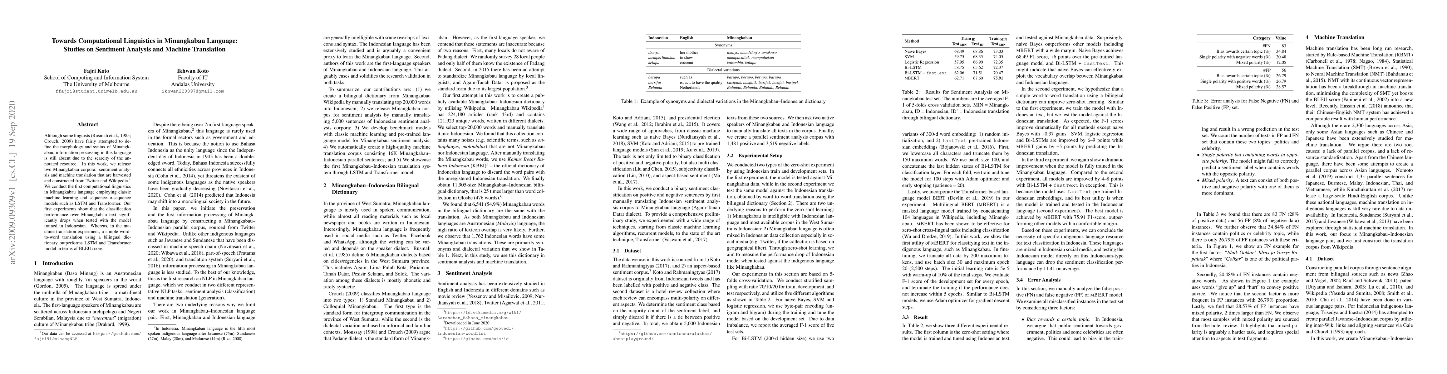 Researchers created two Minangkabau language corpora for sentiment analysis and machine translation, using Twitter and Wikipedia data, and found that a simple word-to-word translation outperformed complex models in terms of accuracy.