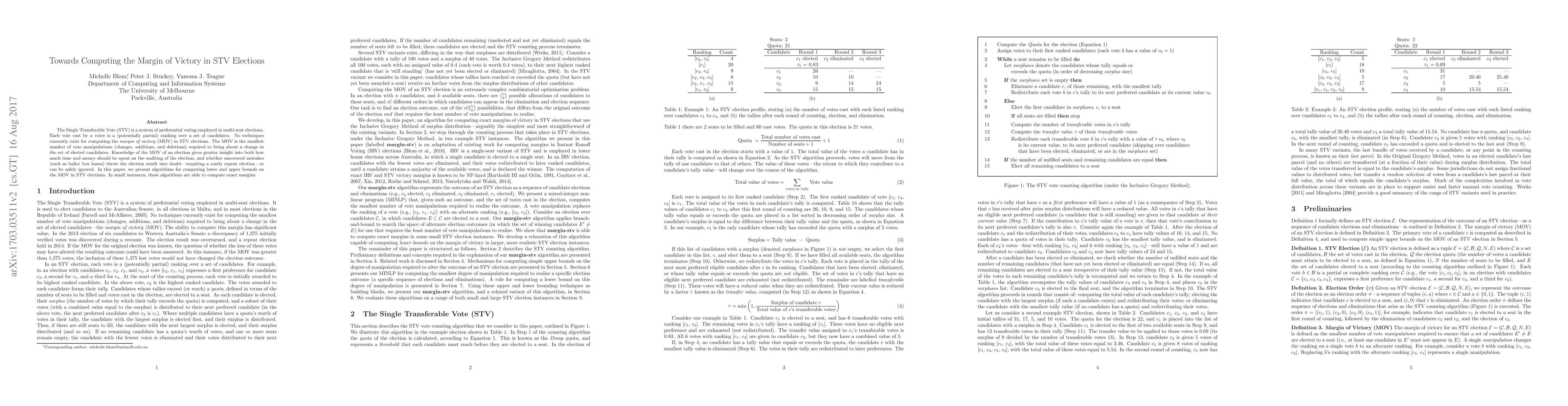 The paper presents margin-stv, an algorithm for computing exact margins of victory in STV elections, based on solving a mixed-integer nonlinear programming formulation for minimal manipulation to achieve a desired election order. It can compute exact margins for small elections and reasonable lower bounds for larger real-world elections within 24 hours.