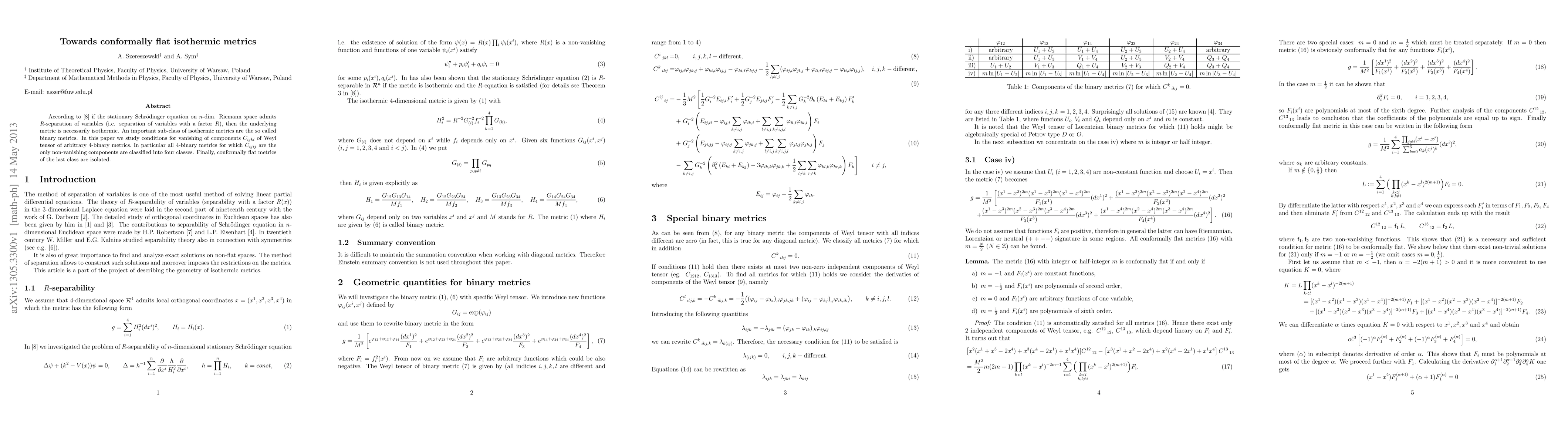 According to [8] if the stationary Schroedinger equation on n-dim. Riemann space admits R-separation of variables (i.e. separation of variables with a factor R), then the underlying metric is necessarily isothermic. An important sub-class of isothermic metrics are the so called binary metrics. In this paper we study conditions for vanishing of components C_ijkl of Weyl tensor of arbitrary 4-binary metrics. In particular all 4-binary metrics for which C_ijij are the only non-vanishing components are classified into four classes. Finally, conformally flat metrics of the last class are isolated.