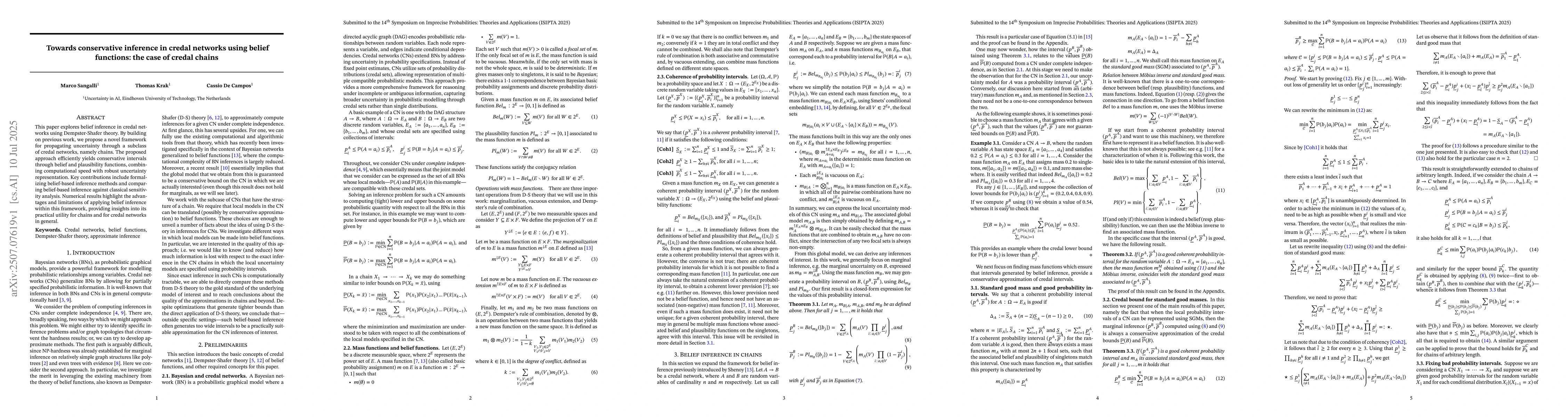 This paper explores belief inference in credal networks using Dempster-Shafer theory. By building on previous work, we propose a novel framework for propagating uncertainty through a subclass of credal networks, namely chains. The proposed approach efficiently yields conservative intervals through belief and plausibility functions, combining computational speed with robust uncertainty representation. Key contributions include formalizing belief-based inference methods and comparing belief-based inference against classical sensitivity analysis. Numerical results highlight the advantages and limitations of applying belief inference within this framework, providing insights into its practical utility for chains and for credal networks in general.