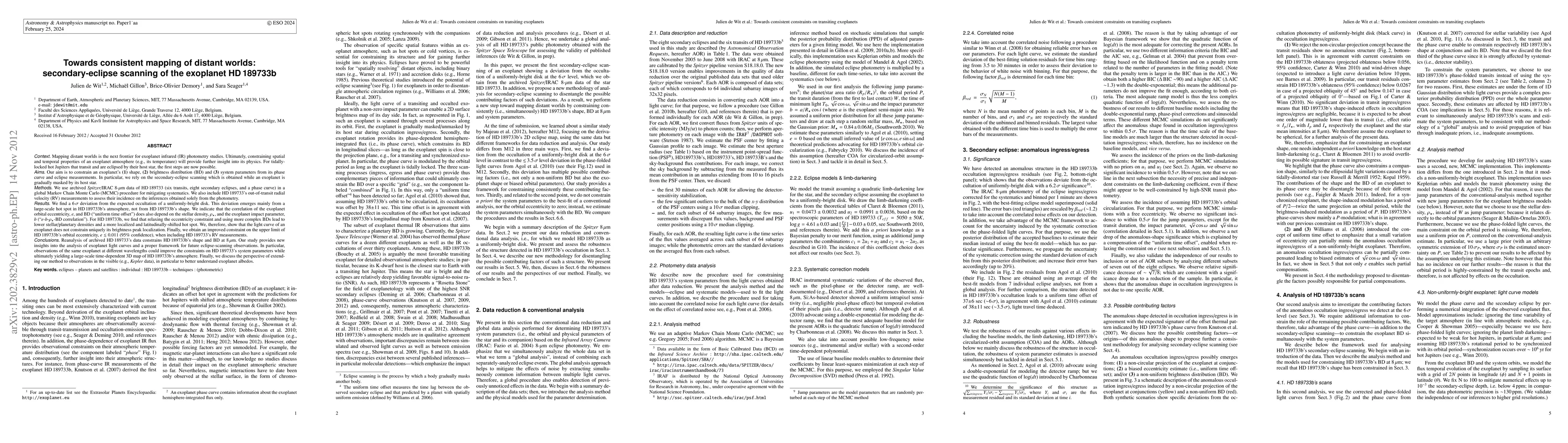 Mapping distant worlds is the next frontier for exoplanet infrared photometry studies. Ultimately, constraining spatial and temporal properties of an exoplanet atmosphere will provide further insight into its physics. For tidally-locked hot Jupiters that transit and are eclipsed by their host star, the first steps are now possible. Our aim is to constrain an exoplanet's shape, brightness distribution (BD) and system parameters from its light curve. Notably, we rely on the eclipse scanning. We use archived Spitzer 8-{\mu}m data of HD189733 (6 transits, 8 secondary eclipses, and a phase curve) in a global MCMC procedure for mitigating systematics. We also include HD189733's out-of-transit radial velocity measurements. We find a 6-{\sigma} deviation from the expected occultation of a uniformly-bright disk. This deviation emerges mainly from HD189733b's thermal pattern, not from its shape. We indicate that the correlation of the orbital eccentricity, e, and BD (uniform time offset) does also depend on the stellar density, \rho*, and the impact parameter, b (e-b-\rho*-BD correlation). For HD189733b, we find that relaxing the e-constraint and using more complex BDs lead to lower stellar/planetary densities and a more localized and latitudinally-shifted hot spot. We obtain an improved constraint on the upper limit of HD189733b's orbital eccentricity, e<0.011 (95%), when including the RV measurements. Our study provides new insights into the analysis of exoplanet light curves and a proper framework for future eclipse-scanning observations. Observations of the same exoplanet at different wavelengths will improve the constraints on its system parameters while ultimately yielding a large-scale time-dependent 3D map of its atmosphere. Finally, we discuss the perspective of extending our method to observations in the visible, in particular to better understand exoplanet albedos.