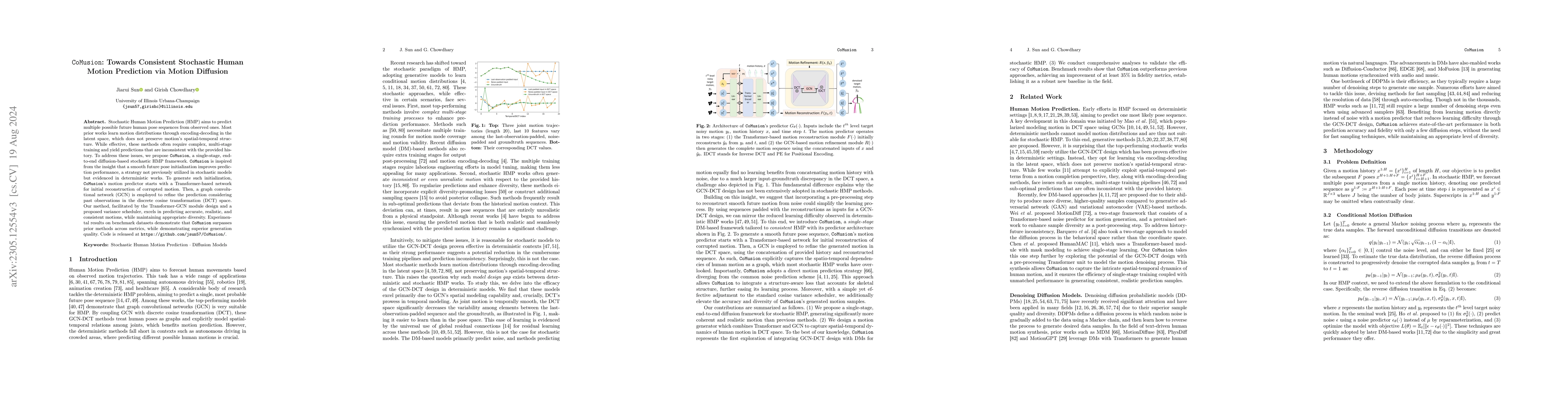 The paper proposes DiffMotion, a diffusion-based stochastic human motion prediction framework that uses a Transformer-GCN module to reconstruct and refine motion sequences, achieving accurate, consistent, and diverse predictions while outperforming previous methods in accuracy and robustness.
