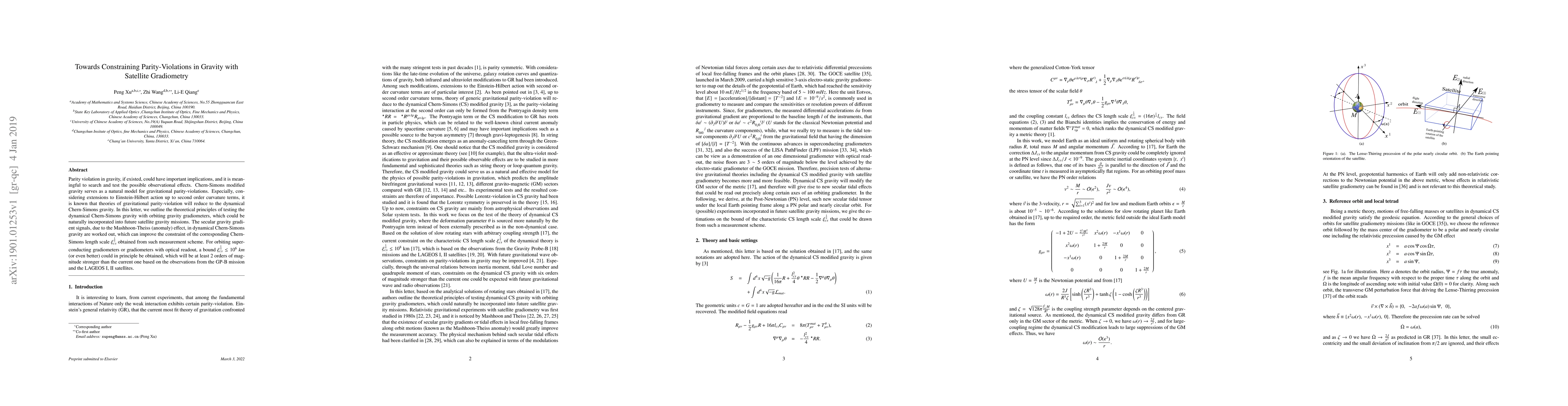 This paper proposes using satellite-based gravity gradiometers to test for parity-violations in gravity, specifically within the framework of dynamical Chern-Simons gravity. It outlines how these gradiometers could measure the Mashhoon-Theiss effect to constrain the Chern-Simons length scale, potentially achieving constraints two orders of magnitude better than current limits.