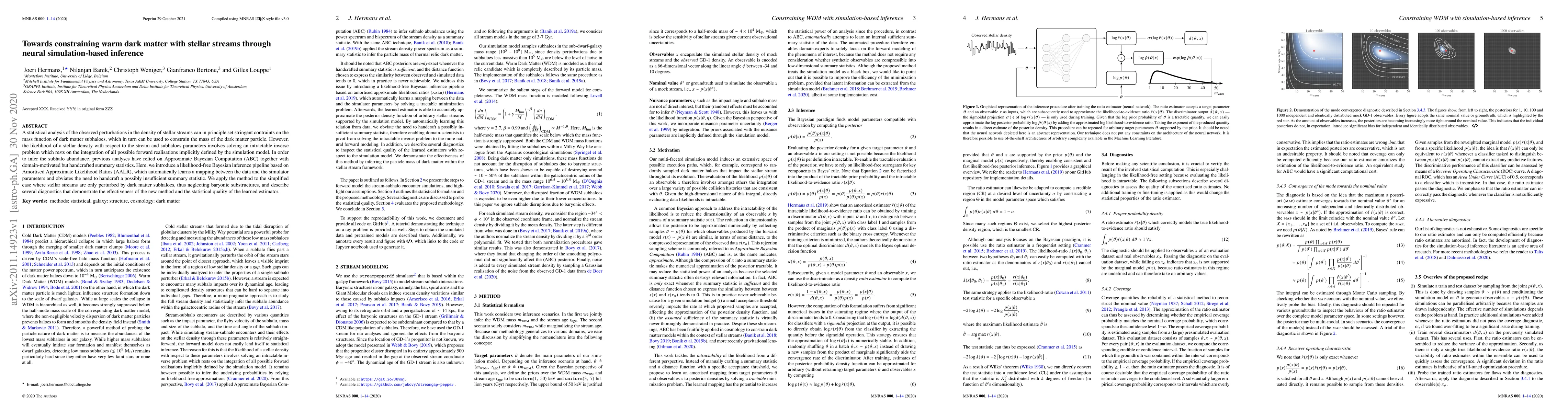 This paper proposes a novel likelihood-free Bayesian inference method using Amortised Approximate Likelihood Ratios (AALR) to constrain warm dark matter by analyzing stellar stream perturbations, replacing traditional Approximate Bayesian Computation (ABC) and handcrafted summary statistics. The method demonstrates effectiveness through diagnostics in the simplified scenario of streams perturbed only by dark matter subhaloes.