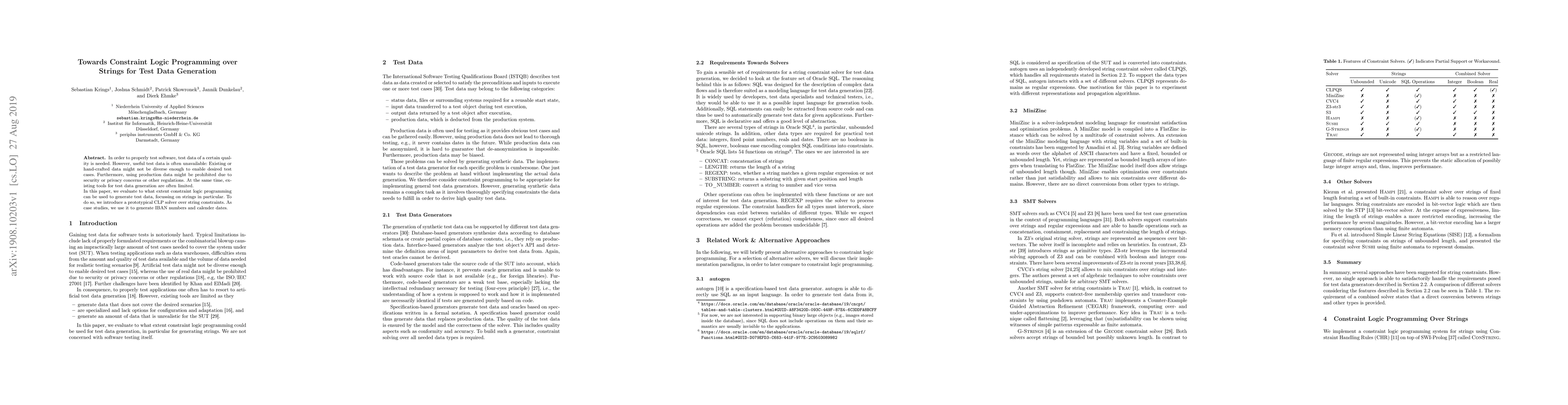 This paper introduces a prototypical CLP solver for generating test data over strings, specifically using constraint logic programming to create diverse IBAN numbers and calendar dates.