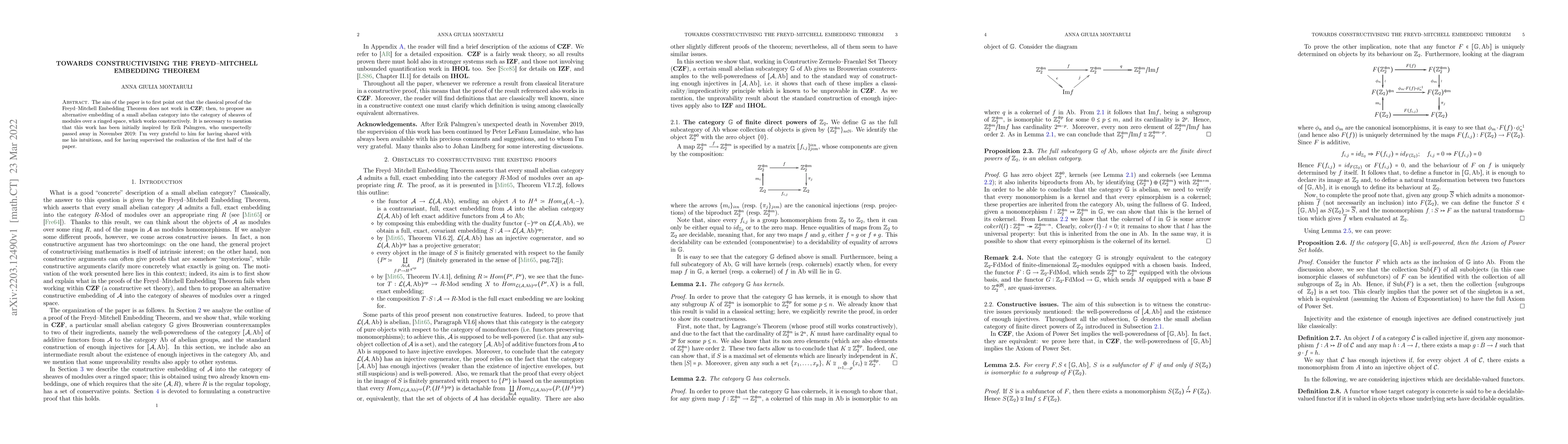 The aim of the paper is to first point out that the classical proof of the Freyd-Mitchell Embedding Theorem does not work in CZF; then, to propose an alternative embedding of a small abelian category into the category of sheaves of modules over a ringed space, which works constructively. It is necessary to mention that this work has been initially inspired by Erik Palmgren, who unexpectedly passed away in November 2019: I'm very grateful to him for having shared with me his intuitions, and for having supervised the realization of the first half of the paper.