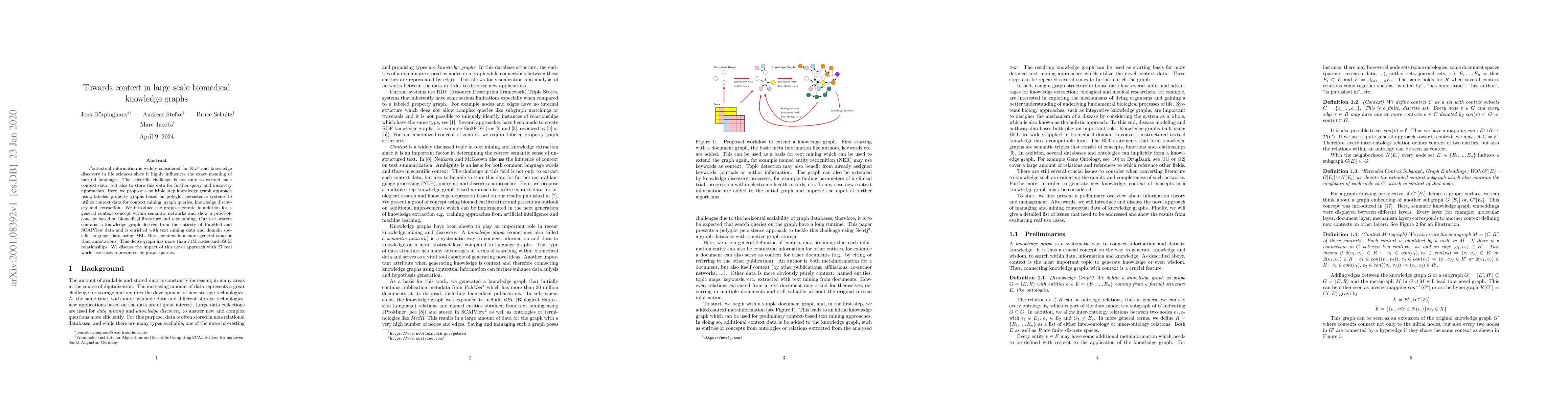 This paper proposes a multi-step knowledge graph approach to incorporate contextual information in large-scale biomedical knowledge graphs, utilizing polyglot persistence systems for efficient data storage and querying. The study introduces a graph-theoretic foundation for context within semantic networks and demonstrates its application through a proof-of-concept enriched with data from PubMed and SCAIView, showcasing its impact with 27 real-world use cases.