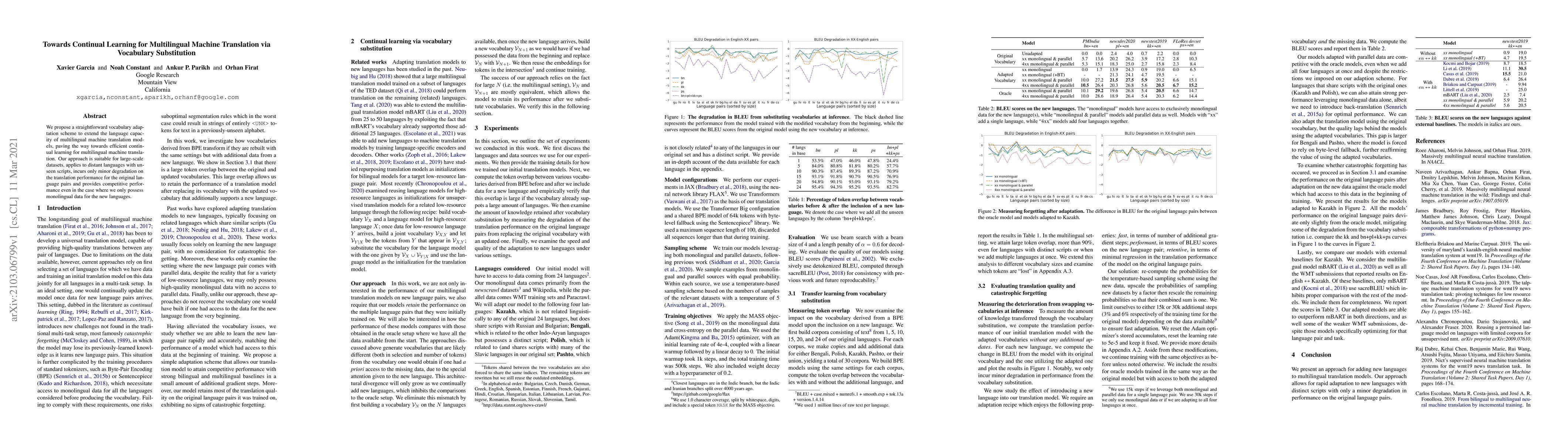 This paper introduces a vocabulary substitution method to enhance multilingual machine translation models' language capacity, enabling efficient continual learning. The approach effectively handles distant languages with unseen scripts and maintains translation performance for original language pairs, even with monolingual data for new languages.
