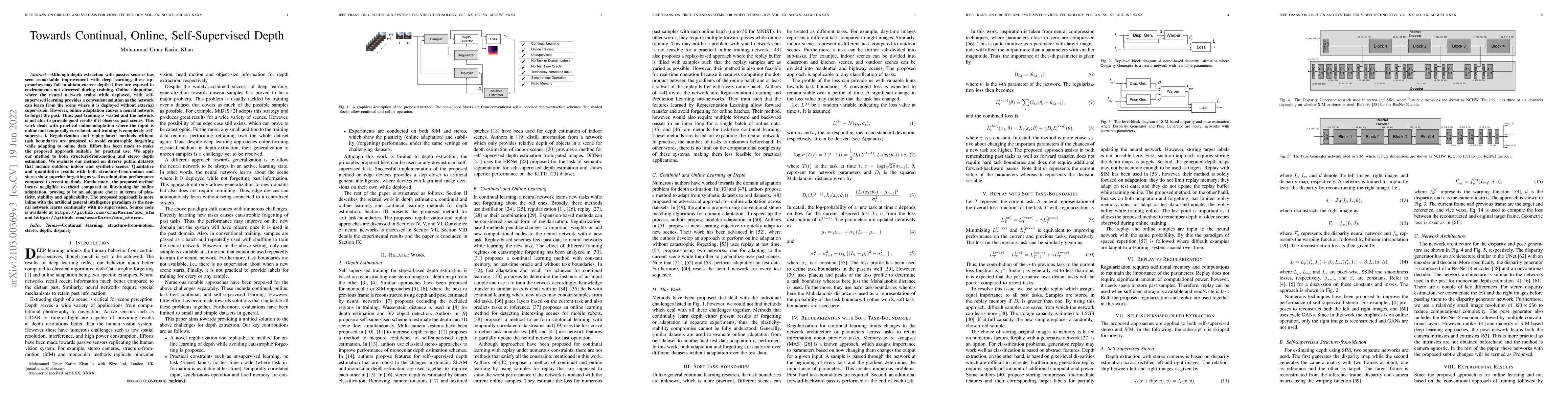 Although depth extraction with passive sensors has seen remarkable improvement with deep learning, these approaches may fail to obtain correct depth if they are exposed to environments not observed during training. Online adaptation, where the neural network trains while deployed, with self-supervised learning provides a convenient solution as the network can learn from the scene where it is deployed without external supervision. However, online adaptation causes a neural network to forget the past. Thus, past training is wasted and the network is not able to provide good results if it observes past scenes. This work deals with practical online-adaptation where the input is online and temporally-correlated, and training is completely self-supervised. Regularization and replay-based methods without task boundaries are proposed to avoid catastrophic forgetting while adapting to online data. Effort has been made to make the proposed approach suitable for practical use. We apply our method to both structure-from-motion and stereo depth estimation. We evaluate our method on diverse public datasets that include outdoor, indoor and synthetic scenes. Qualitative and quantitative results with both structure-from-motion and stereo show superior forgetting as well as adaptation performance compared to recent methods. Furthermore, the proposed method incurs negligible overhead compared to fine-tuning for online adaptation, proving to be an adequate choice in terms of plasticity, stability and applicability. The proposed approach is more inline with the artificial general intelligence paradigm as the neural network learns continually with no supervision. Source code is available at https://github.com/umarKarim/cou_sfm and https://github.com/umarKarim/cou_stereo.