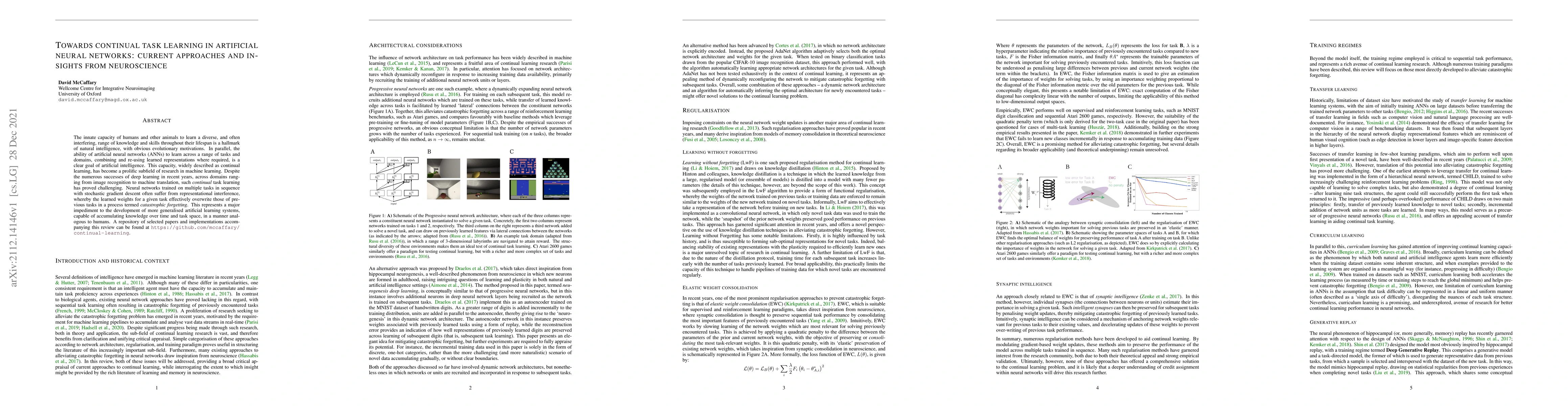 The innate capacity of humans and other animals to learn a diverse, and often interfering, range of knowledge and skills throughout their lifespan is a hallmark of natural intelligence, with obvious evolutionary motivations. In parallel, the ability of artificial neural networks (ANNs) to learn across a range of tasks and domains, combining and re-using learned representations where required, is a clear goal of artificial intelligence. This capacity, widely described as continual learning, has become a prolific subfield of research in machine learning. Despite the numerous successes of deep learning in recent years, across domains ranging from image recognition to machine translation, such continual task learning has proved challenging. Neural networks trained on multiple tasks in sequence with stochastic gradient descent often suffer from representational interference, whereby the learned weights for a given task effectively overwrite those of previous tasks in a process termed catastrophic forgetting. This represents a major impediment to the development of more generalised artificial learning systems, capable of accumulating knowledge over time and task space, in a manner analogous to humans. A repository of selected papers and implementations accompanying this review can be found at https://github.com/mccaffary/continual-learning.