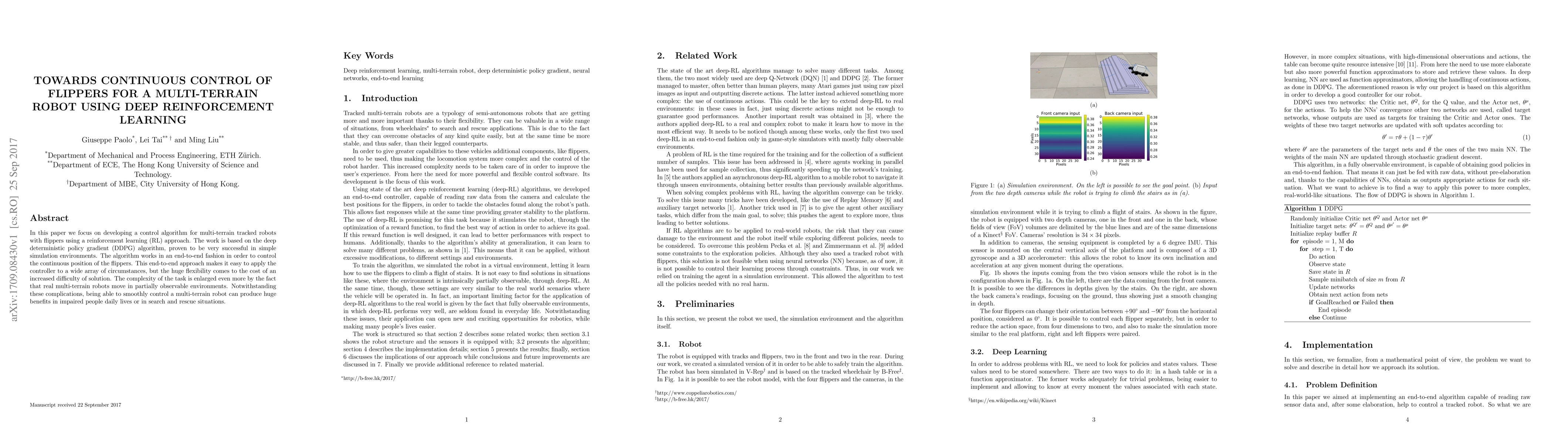 In this paper we focus on developing a control algorithm for multi-terrain tracked robots with flippers using a reinforcement learning (RL) approach. The work is based on the deep deterministic policy gradient (DDPG) algorithm, proven to be very successful in simple simulation environments. The algorithm works in an end-to-end fashion in order to control the continuous position of the flippers. This end-to-end approach makes it easy to apply the controller to a wide array of circumstances, but the huge flexibility comes to the cost of an increased difficulty of solution. The complexity of the task is enlarged even more by the fact that real multi-terrain robots move in partially observable environments. Notwithstanding these complications, being able to smoothly control a multi-terrain robot can produce huge benefits in impaired people daily lives or in search and rescue situations.