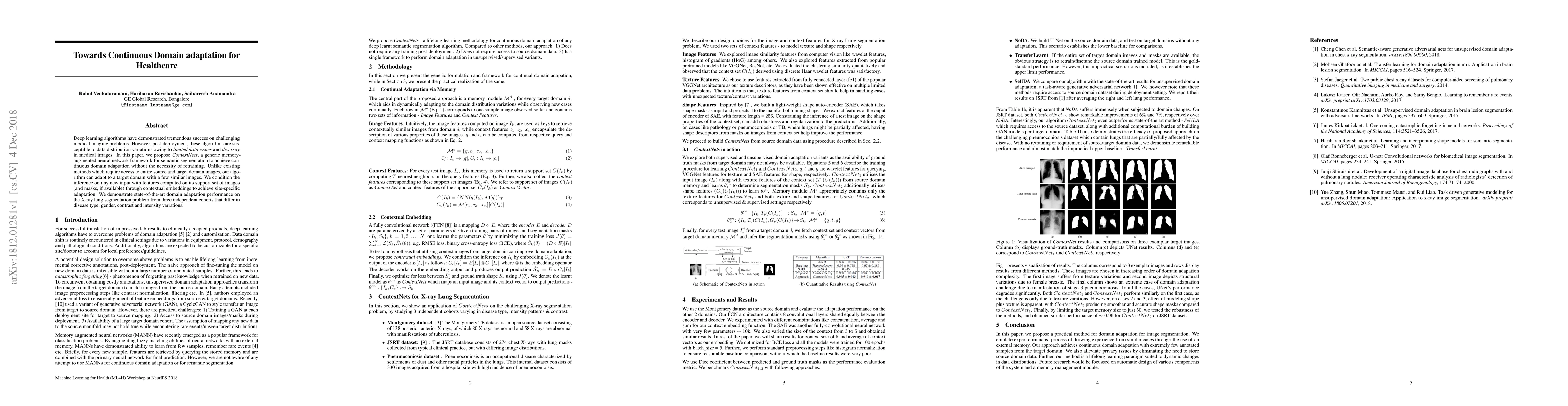 This paper introduces ContextNets, a memory-augmented neural network for continuous domain adaptation in medical imaging, enabling adaptation with minimal retraining and a few target domain images. It demonstrates superior domain adaptation performance in X-ray lung segmentation across diverse cohorts.