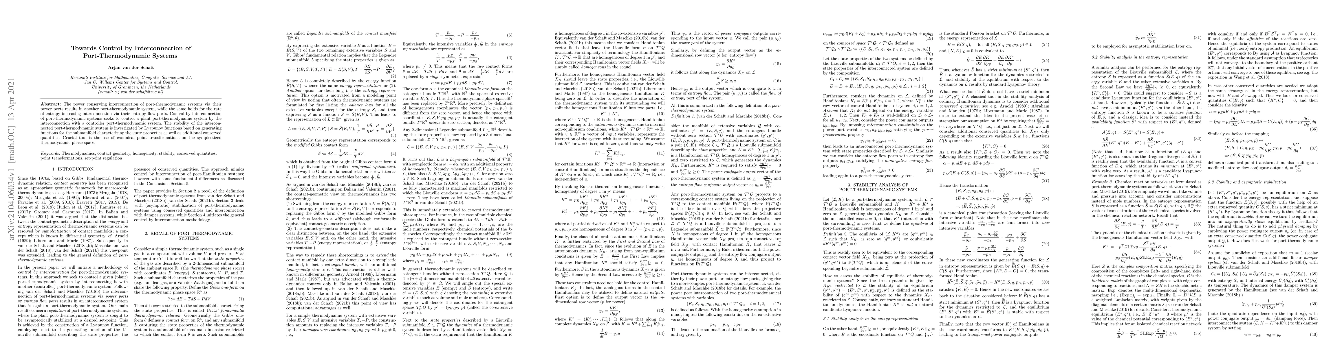 The power conserving interconnection of port-thermodynamic systems via their power ports results in another port-thermodynamic system, while the same holds for the rate of entropy increasing interconnection via their entropy flow ports. Control by interconnection of port-thermodynamic systems seeks to control a plant port-thermodynamic system by the interconnection with a controller port-thermodynamic system. The stability of the interconnected port-thermodynamic system is investigated by Lyapunov functions based on generating functions for the submanifold characterizing the state properties as well as additional conserved quantities. Crucial tool is the use of canonical point transformations on the symplectized thermodynamic phase space.