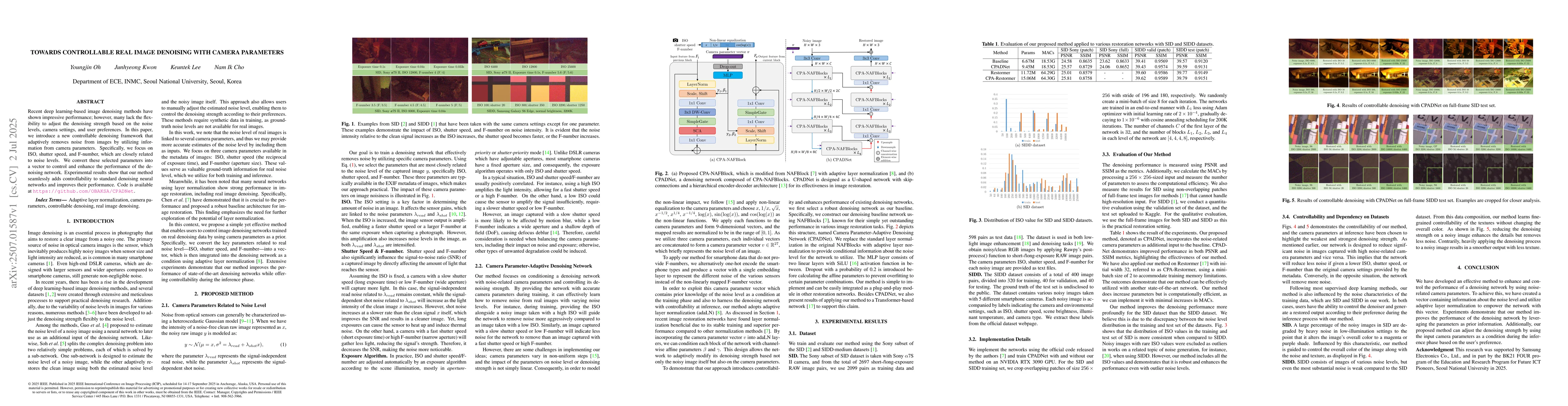 This research introduces a controllable image denoising framework that uses camera parameters like ISO, shutter speed, and F-number to adaptively adjust denoising strength. Experiments demonstrate improved denoising performance with added flexibility for user preferences and camera settings.