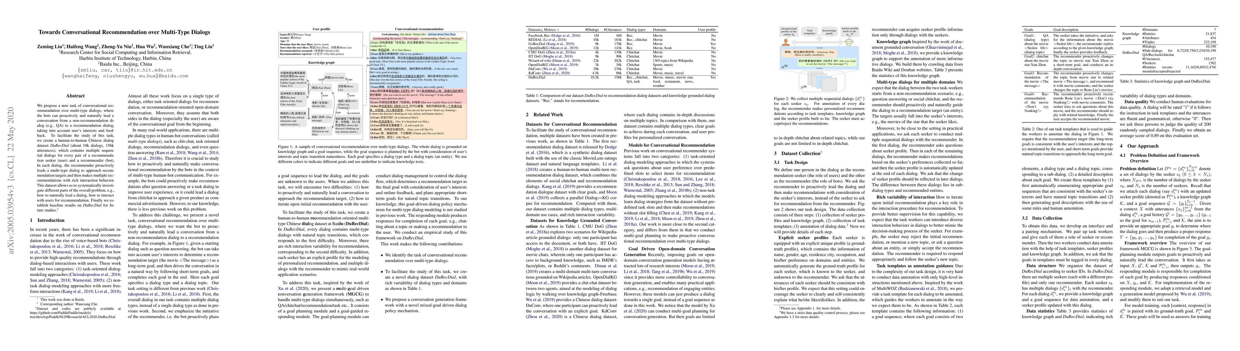 This paper introduces a new conversational recommendation task over multi-type dialogs, proposing a method for bots to transition from non-recommendation to recommendation dialogues based on user interests. It presents the DuRecDial dataset, a human-to-human Chinese conversation dataset, to facilitate research and establishes baseline results for future studies.