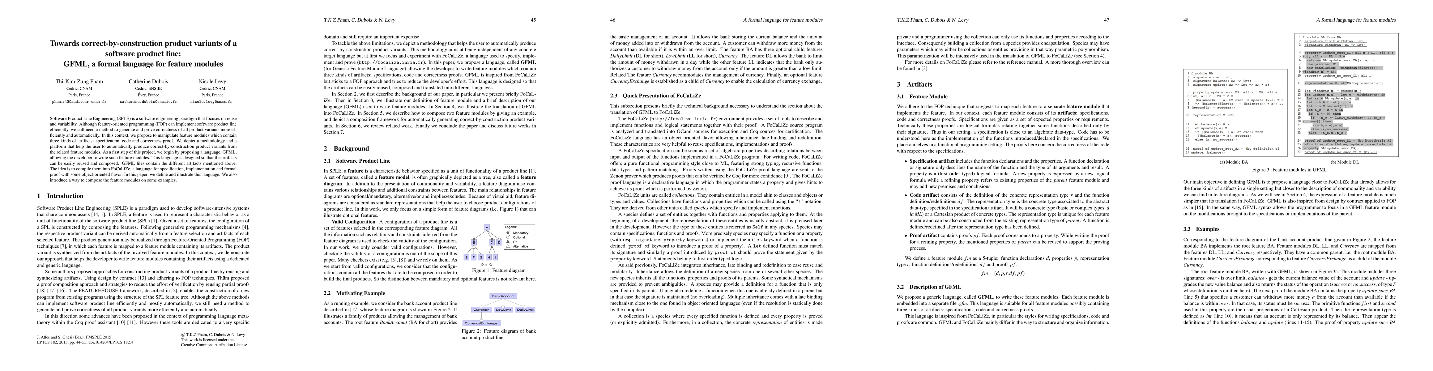 Software Product Line Engineering (SPLE) is a software engineering paradigm that focuses on reuse and variability. Although feature-oriented programming (FOP) can implement software product line efficiently, we still need a method to generate and prove correctness of all product variants more efficiently and automatically. In this context, we propose to manipulate feature modules which contain three kinds of artifacts: specification, code and correctness proof. We depict a methodology and a platform that help the user to automatically produce correct-by-construction product variants from the related feature modules. As a first step of this project, we begin by proposing a language, GFML, allowing the developer to write such feature modules. This language is designed so that the artifacts can be easily reused and composed. GFML files contain the different artifacts mentioned above.The idea is to compile them into FoCaLiZe, a language for specification, implementation and formal proof with some object-oriented flavor. In this paper, we define and illustrate this language. We also introduce a way to compose the feature modules on some examples.