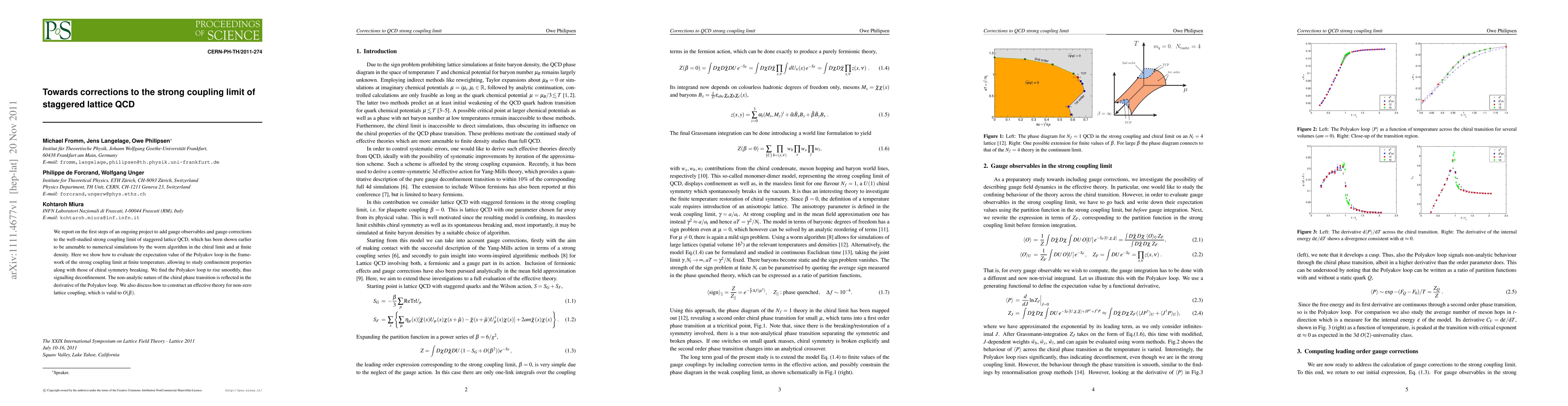 This paper initiates efforts to enhance the strong coupling limit of staggered lattice QCD by incorporating gauge observables and corrections. It demonstrates the evaluation of the Polyakov loop at finite temperature, revealing smooth deconfinement and the non-analytic chiral phase transition through its derivative. An effective theory for non-zero lattice coupling is also proposed.
