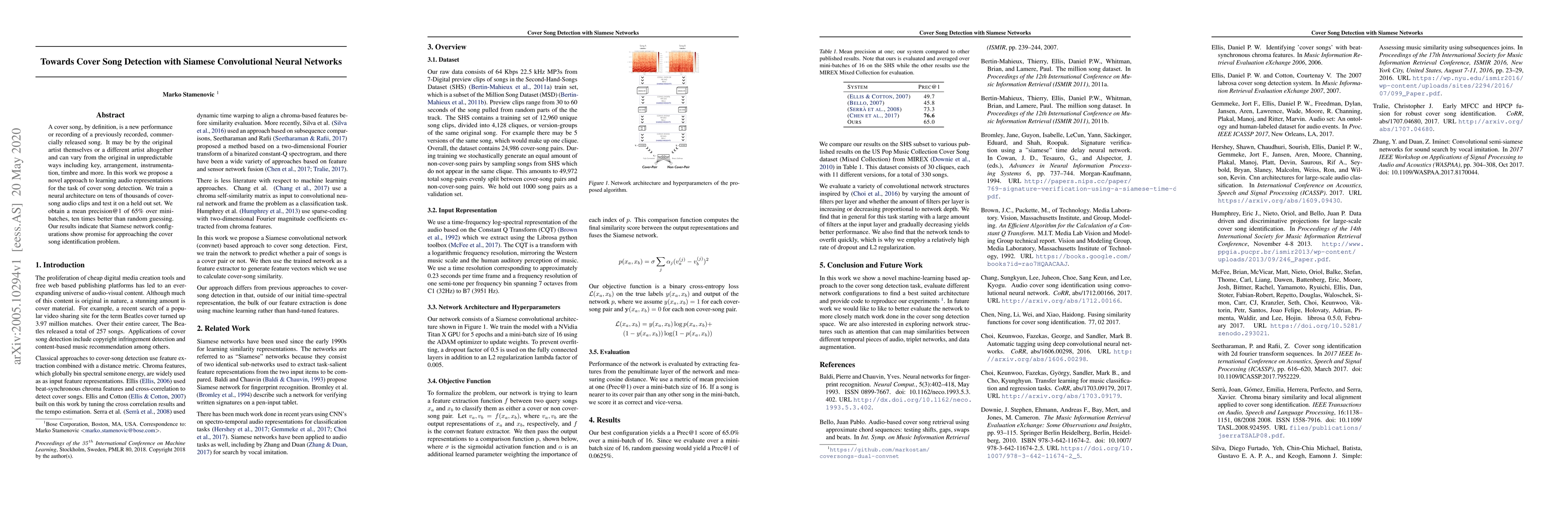 This paper proposes a Siamese convolutional neural network for detecting cover songs, achieving a mean precision@1 of 65% and demonstrating ten times better performance than random guessing. The study indicates that Siamese networks hold promise for identifying variations in cover songs.