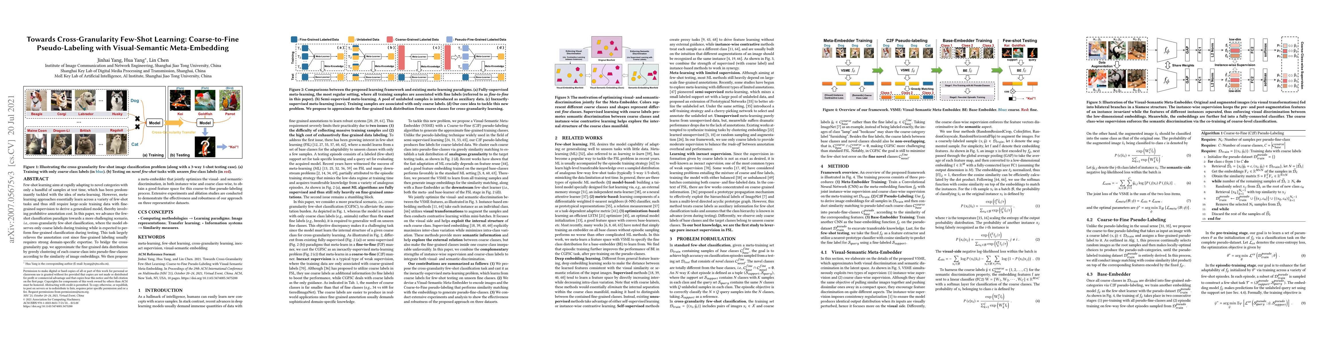 This paper proposes a method for cross-granularity few-shot learning, addressing the challenge of fine-grained classification from coarse-grained training labels. It uses pseudo-labeling and visual-semantic meta-embedding to bridge the label gap, demonstrating effectiveness through extensive experiments on multiple datasets.