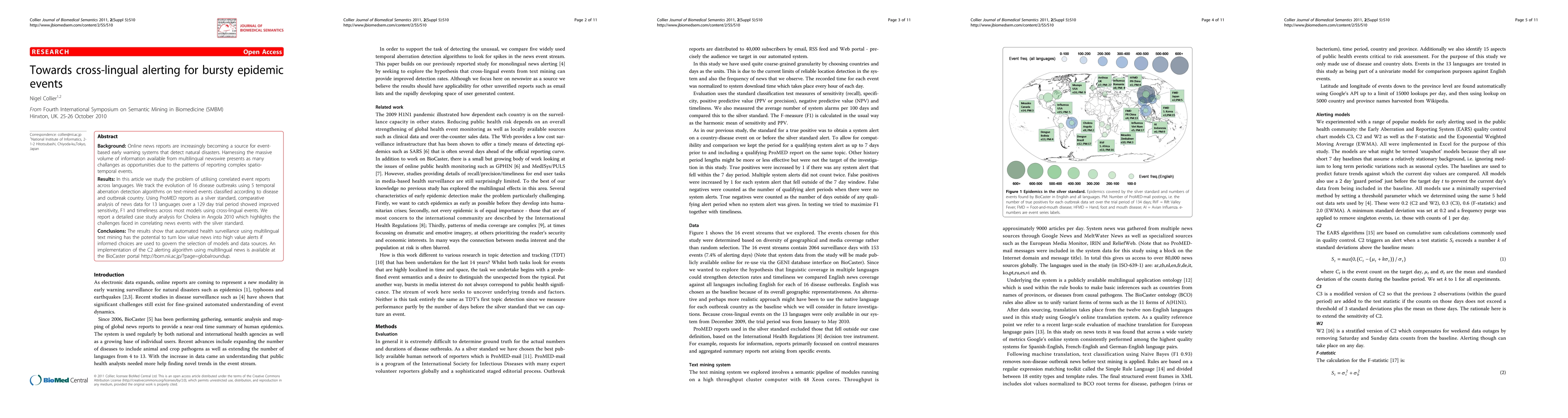 Background: Online news reports are increasingly becoming a source for event based early warning systems that detect natural disasters. Harnessing the massive volume of information available from multilingual newswire presents as many challenges as opportunities due to the patterns of reporting complex spatiotemporal events. Results: In this article we study the problem of utilising correlated event reports across languages. We track the evolution of 16 disease outbreaks using 5 temporal aberration detection algorithms on text-mined events classified according to disease and outbreak country. Using ProMED reports as a silver standard, comparative analysis of news data for 13 languages over a 129 day trial period showed improved sensitivity, F1 and timeliness across most models using cross-lingual events. We report a detailed case study analysis for Cholera in Angola 2010 which highlights the challenges faced in correlating news events with the silver standard. Conclusions: The results show that automated health surveillance using multilingual text mining has the potential to turn low value news into high value alerts if informed choices are used to govern the selection of models and data sources. An implementation of the C2 alerting algorithm using multilingual news is available at the BioCaster portal http://born.nii.ac.jp/?page=globalroundup.