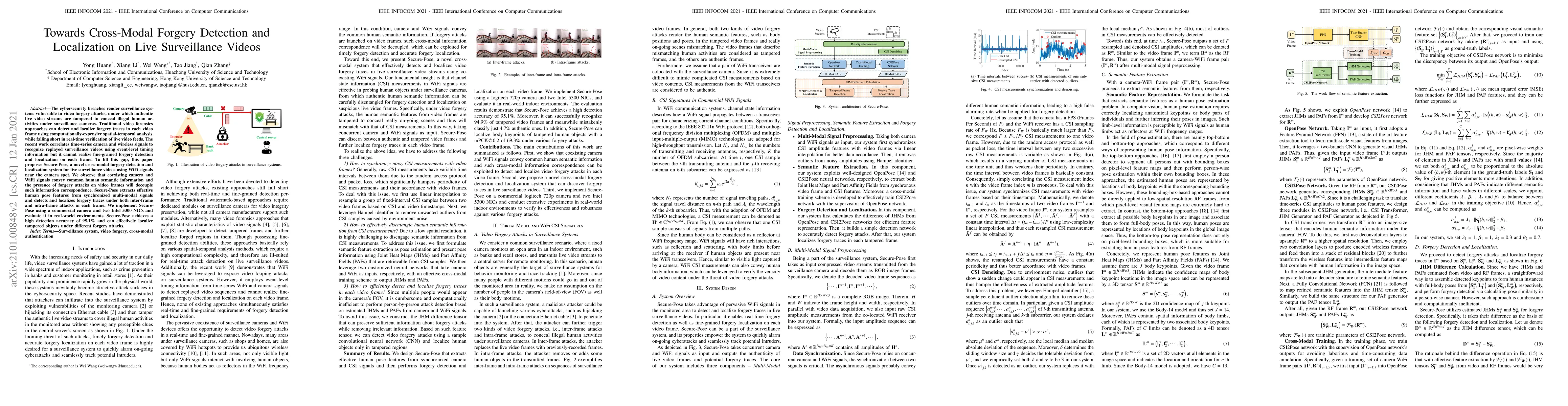 This paper proposes Secure-Pose, a cross-modal system for detecting and localizing video forgeries in live surveillance videos using WiFi signals. Secure-Pose leverages the decoupling of human semantic information in synchronized camera and WiFi signals to achieve high detection accuracy and fine-grained localization of forgery attacks.