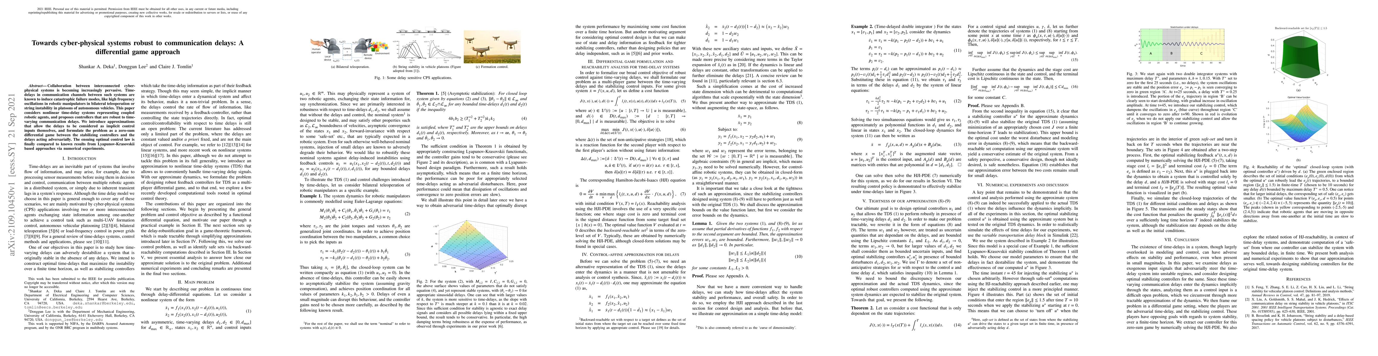 Collaboration between interconnected cyber-physical systems is becoming increasingly pervasive. Time-delays in communication channels between such systems are known to induce catastrophic failure modes, like high frequency oscillations in robotic manipulators in bilateral teleoperation or string instability in platoons of autonomous vehicles. This paper considers nonlinear time-delay systems representing coupled robotic agents, and proposes controllers that are robust to time-varying communication delays. We introduce approximations that allow the delays to be considered as implicit control inputs themselves, and formulate the problem as a zero-sum differential game between the stabilizing controllers and the delays acting adversarially. The ensuing optimal control law is finally compared to known results from Lyapunov-Krasovskii based approaches via numerical experiments.