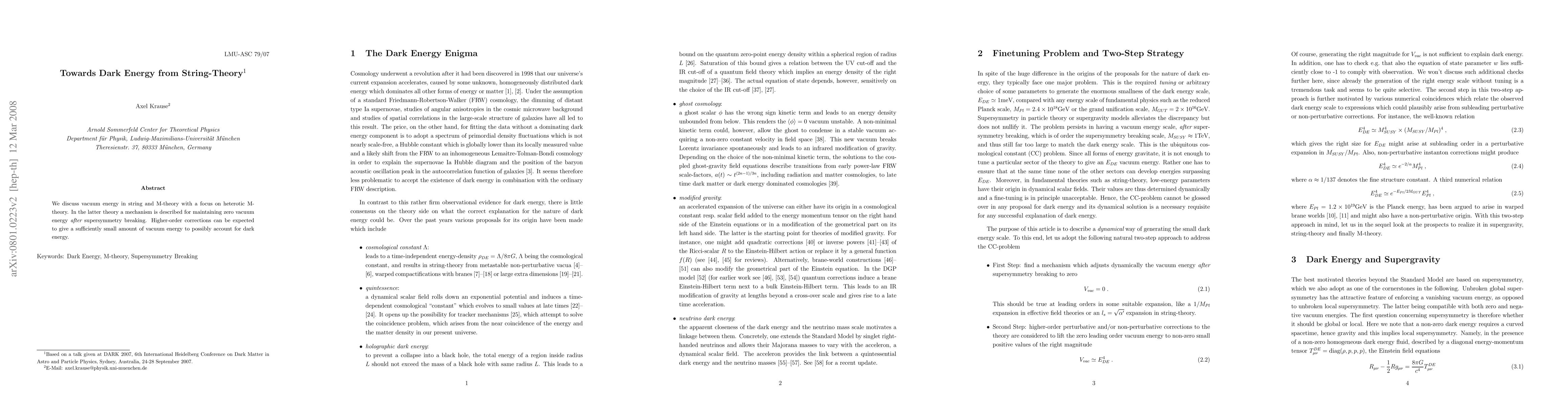 This paper explores vacuum energy in string and M-theory, particularly heterotic M-theory, where a mechanism ensures zero vacuum energy post-supersymmetry breaking, suggesting higher-order corrections could yield a small vacuum energy potentially explaining dark energy.