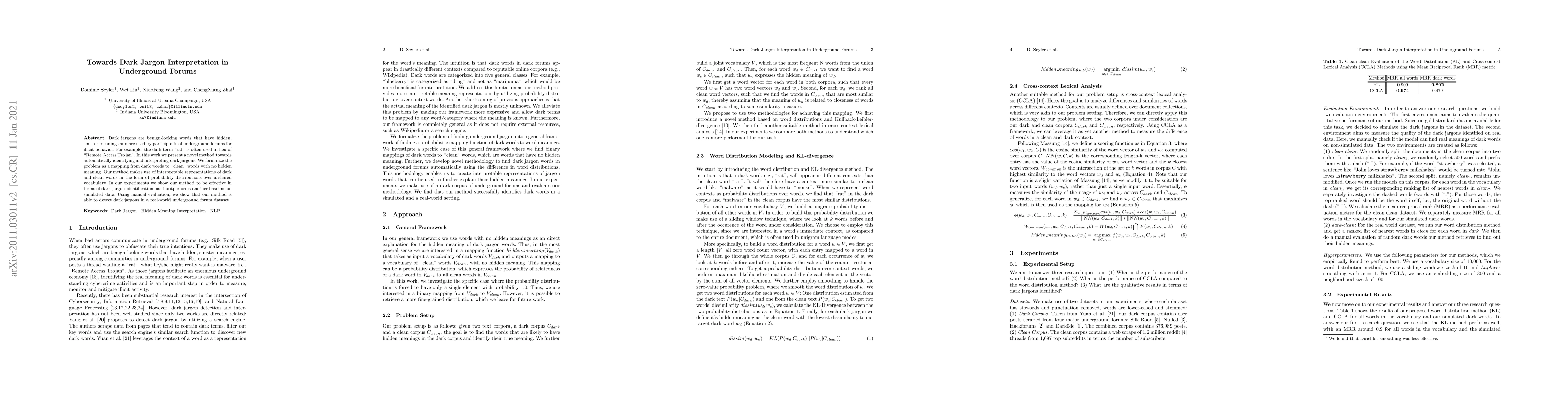 Researchers develop a method to automatically identify and interpret dark jargons used in underground forums, outperforming existing methods in simulated data and real-world applications.
