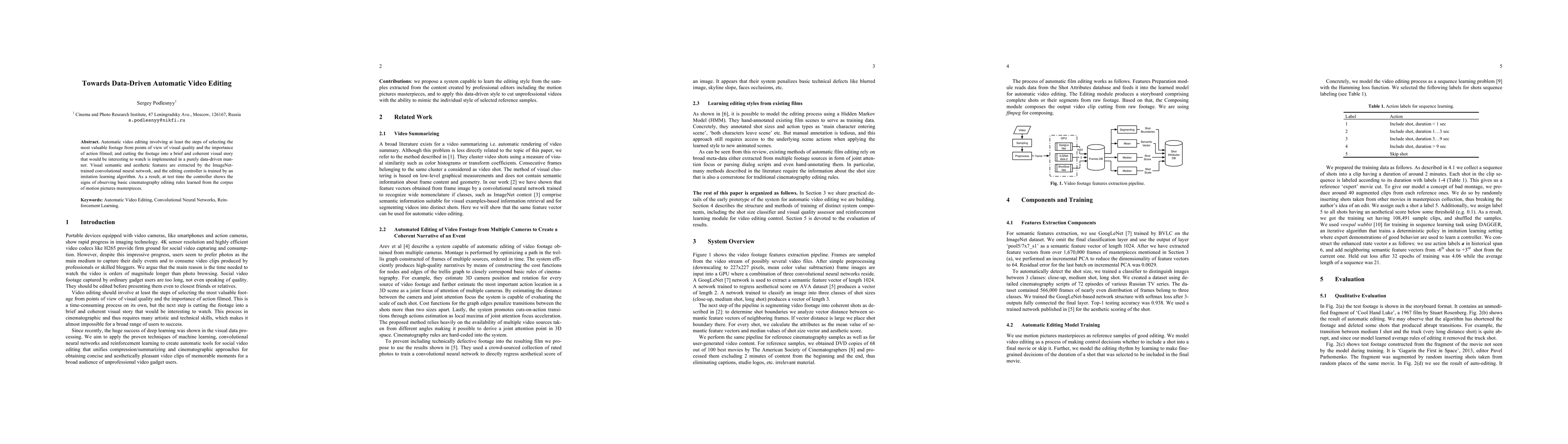 Automatic video editing involving at least the steps of selecting the most valuable footage from points of view of visual quality and the importance of action filmed; and cutting the footage into a brief and coherent visual story that would be interesting to watch is implemented in a purely data-driven manner. Visual semantic and aesthetic features are extracted by the ImageNet-trained convolutional neural network, and the editing controller is trained by an imitation learning algorithm. As a result, at test time the controller shows the signs of observing basic cinematography editing rules learned from the corpus of motion pictures masterpieces.