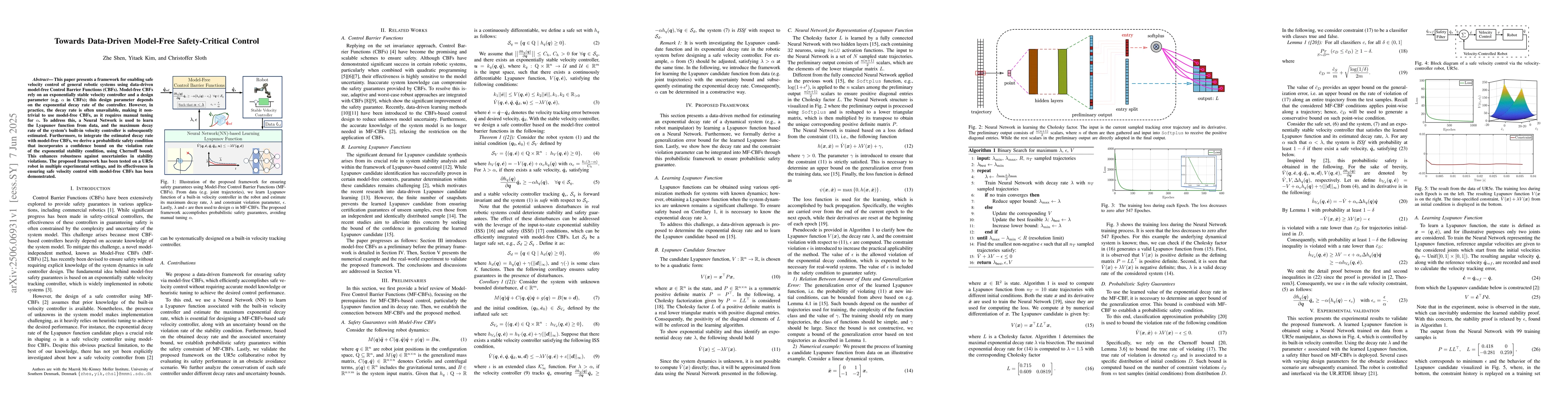 This paper presents a framework for enabling safe velocity control of general robotic systems using data-driven model-free Control Barrier Functions (CBFs). Model-free CBFs rely on an exponentially stable velocity controller and a design parameter (e.g. alpha in CBFs); this design parameter depends on the exponential decay rate of the controller. However, in practice, the decay rate is often unavailable, making it non-trivial to use model-free CBFs, as it requires manual tuning for alpha. To address this, a Neural Network is used to learn the Lyapunov function from data, and the maximum decay rate of the systems built-in velocity controller is subsequently estimated. Furthermore, to integrate the estimated decay rate with model-free CBFs, we derive a probabilistic safety condition that incorporates a confidence bound on the violation rate of the exponential stability condition, using Chernoff bound. This enhances robustness against uncertainties in stability violations. The proposed framework has been tested on a UR5e robot in multiple experimental settings, and its effectiveness in ensuring safe velocity control with model-free CBFs has been demonstrated.