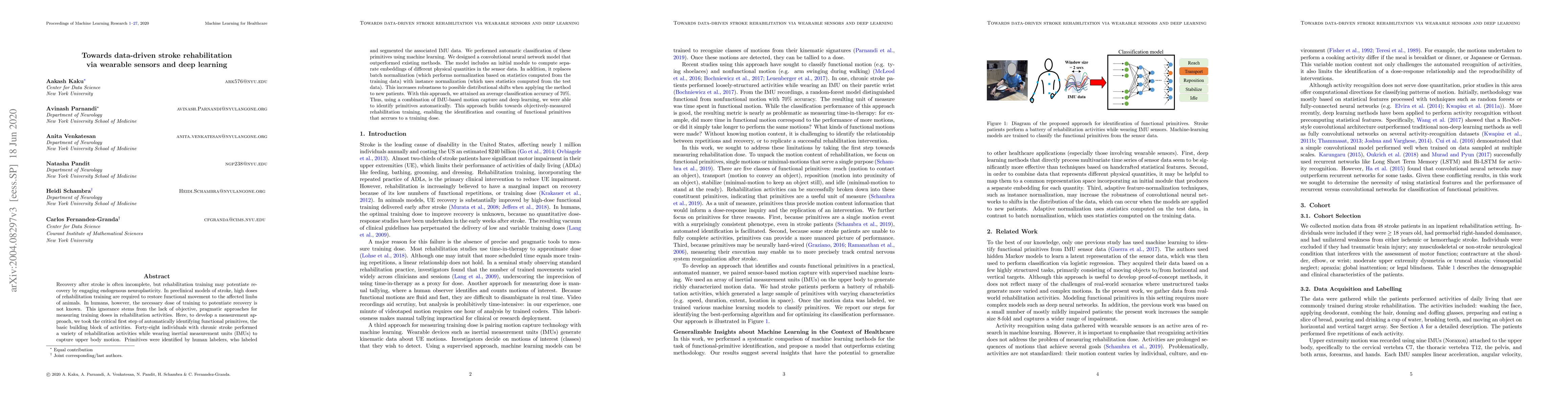 Recovery after stroke is often incomplete, but rehabilitation training may potentiate recovery by engaging endogenous neuroplasticity. In preclinical models of stroke, high doses of rehabilitation training are required to restore functional movement to the affected limbs of animals. In humans, however, the necessary dose of training to potentiate recovery is not known. This ignorance stems from the lack of objective, pragmatic approaches for measuring training doses in rehabilitation activities. Here, to develop a measurement approach, we took the critical first step of automatically identifying functional primitives, the basic building block of activities. Forty-eight individuals with chronic stroke performed a variety of rehabilitation activities while wearing inertial measurement units (IMUs) to capture upper body motion. Primitives were identified by human labelers, who labeled and segmented the associated IMU data. We performed automatic classification of these primitives using machine learning. We designed a convolutional neural network model that outperformed existing methods. The model includes an initial module to compute separate embeddings of different physical quantities in the sensor data. In addition, it replaces batch normalization (which performs normalization based on statistics computed from the training data) with instance normalization (which uses statistics computed from the test data). This increases robustness to possible distributional shifts when applying the method to new patients. With this approach, we attained an average classification accuracy of 70%. Thus, using a combination of IMU-based motion capture and deep learning, we were able to identify primitives automatically. This approach builds towards objectively-measured rehabilitation training, enabling the identification and counting of functional primitives that accrues to a training dose.