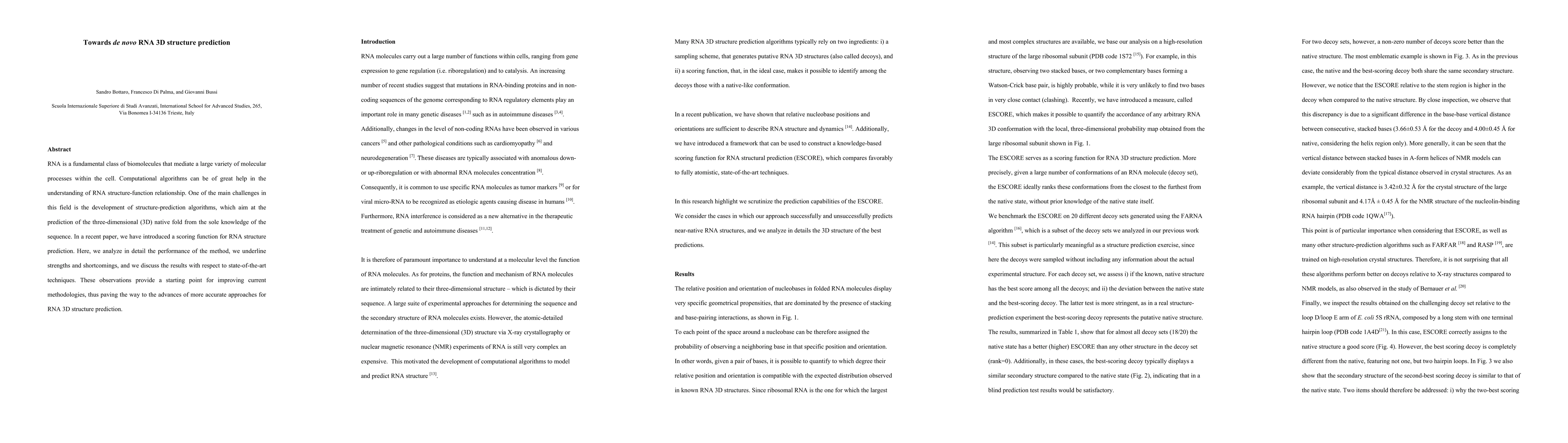 RNA is a fundamental class of biomolecules that mediate a large variety of molecular processes within the cell. Computational algorithms can be of great help in the understanding of RNA structure-function relationship. One of the main challenges in this field is the development of structure-prediction algorithms, which aim at the prediction of the three-dimensional (3D) native fold from the sole knowledge of the sequence. In a recent paper, we have introduced a scoring function for RNA structure prediction. Here, we analyze in detail the performance of the method, we underline strengths and shortcomings, and we discuss the results with respect to state-of-the-art techniques. These observations provide a starting point for improving current methodologies, thus paving the way to the advances of more accurate approaches for RNA 3D structure prediction.