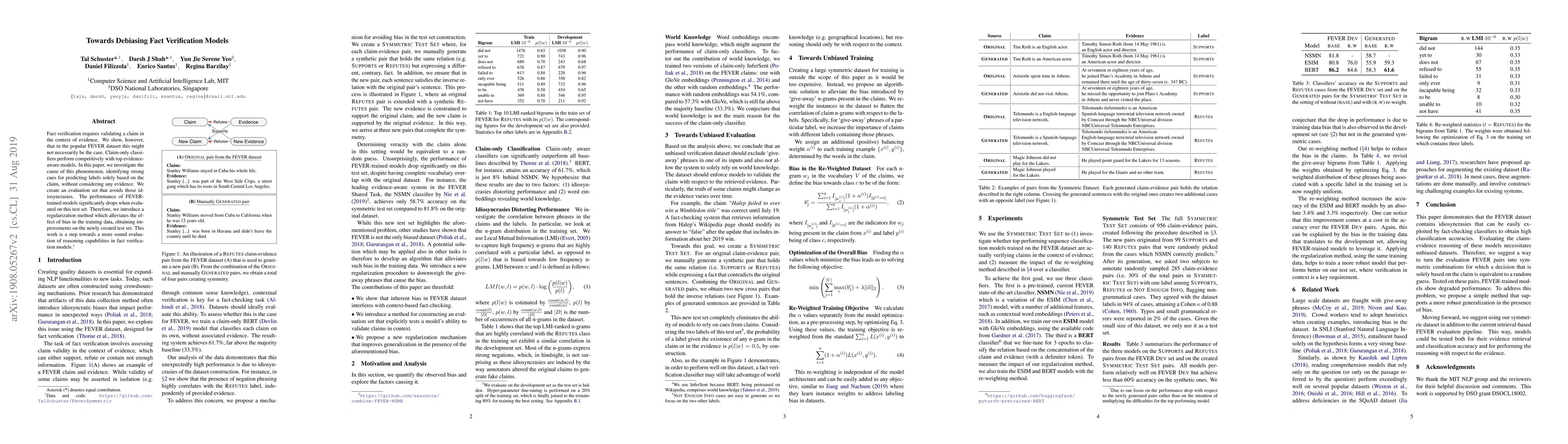 This paper explores biases in the FEVER dataset for fact verification, finding that claim-only classifiers perform well due to strong cues in the evidence. It introduces a new evaluation set and a regularization method to mitigate these biases, demonstrating improved performance and a more accurate assessment of reasoning in fact verification models.