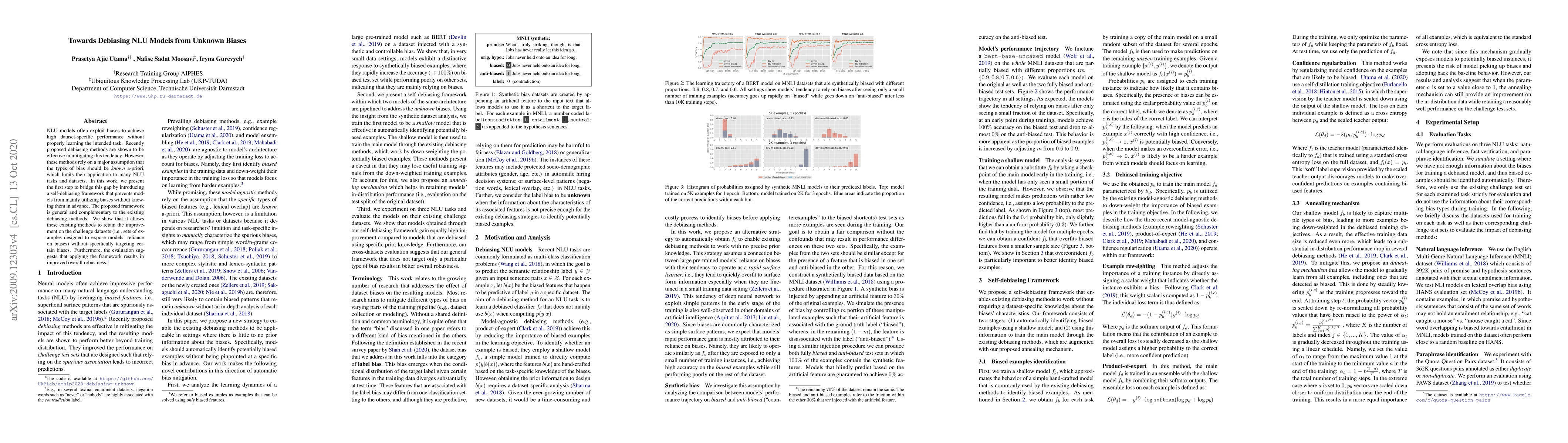 This paper introduces a self-debiasing framework for NLU models that mitigates reliance on unknown biases without requiring prior knowledge of specific biases, enhancing overall robustness and complementing existing debiasing methods. The framework maintains performance improvements on challenge datasets without targeting particular biases.