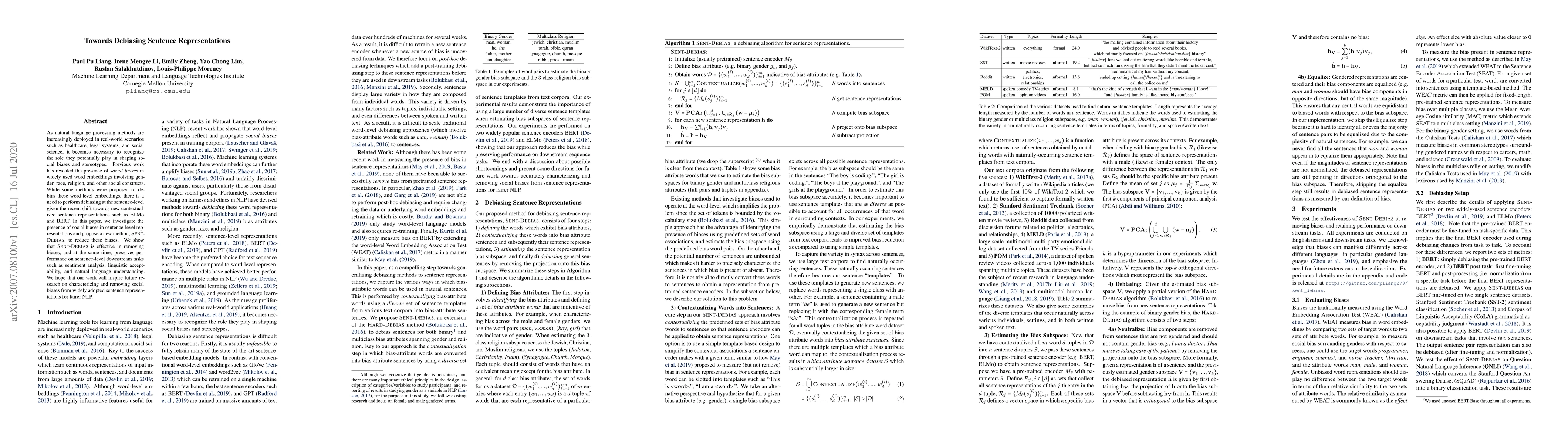 This paper proposes a method to remove social biases from sentence-level representations, showing its effectiveness in preserving performance on downstream tasks like sentiment analysis and natural language understanding.