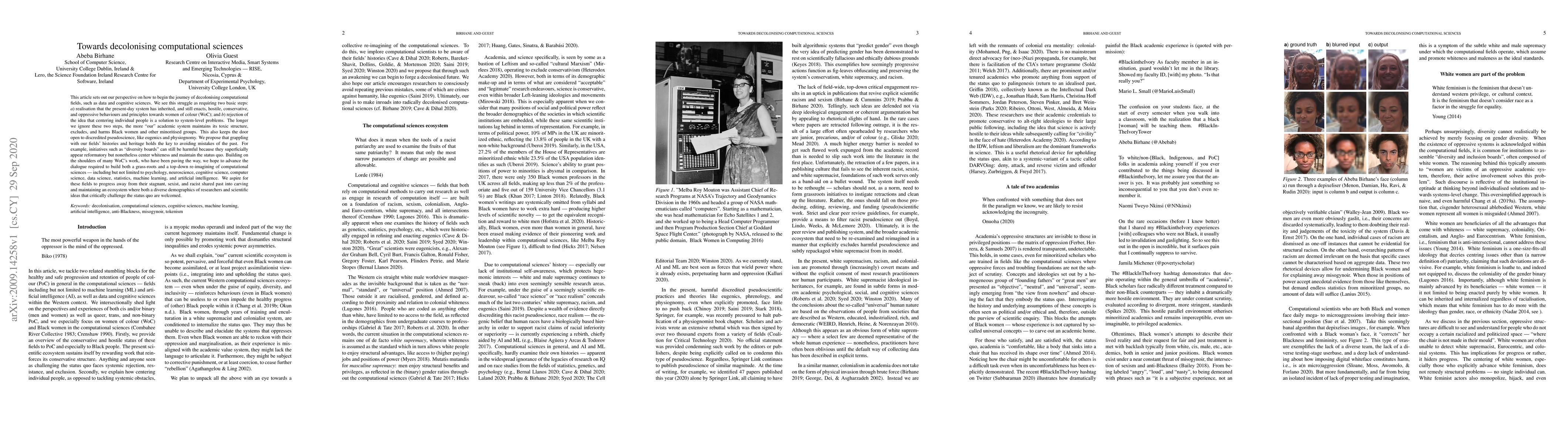 This article sets out our perspective on how to begin the journey of decolonising computational fields, such as data and cognitive sciences. We see this struggle as requiring two basic steps: a) realisation that the present-day system has inherited, and still enacts, hostile, conservative, and oppressive behaviours and principles towards women of colour (WoC); and b) rejection of the idea that centering individual people is a solution to system-level problems. The longer we ignore these two steps, the more "our" academic system maintains its toxic structure, excludes, and harms Black women and other minoritised groups. This also keeps the door open to discredited pseudoscience, like eugenics and physiognomy. We propose that grappling with our fields' histories and heritage holds the key to avoiding mistakes of the past. For example, initiatives such as "diversity boards" can still be harmful because they superficially appear reformatory but nonetheless center whiteness and maintain the status quo. Building on the shoulders of many WoC's work, who have been paving the way, we hope to advance the dialogue required to build both a grass-roots and a top-down re-imagining of computational sciences -- including but not limited to psychology, neuroscience, cognitive science, computer science, data science, statistics, machine learning, and artificial intelligence. We aspire for these fields to progress away from their stagnant, sexist, and racist shared past into carving and maintaining an ecosystem where both a diverse demographics of researchers and scientific ideas that critically challenge the status quo are welcomed.