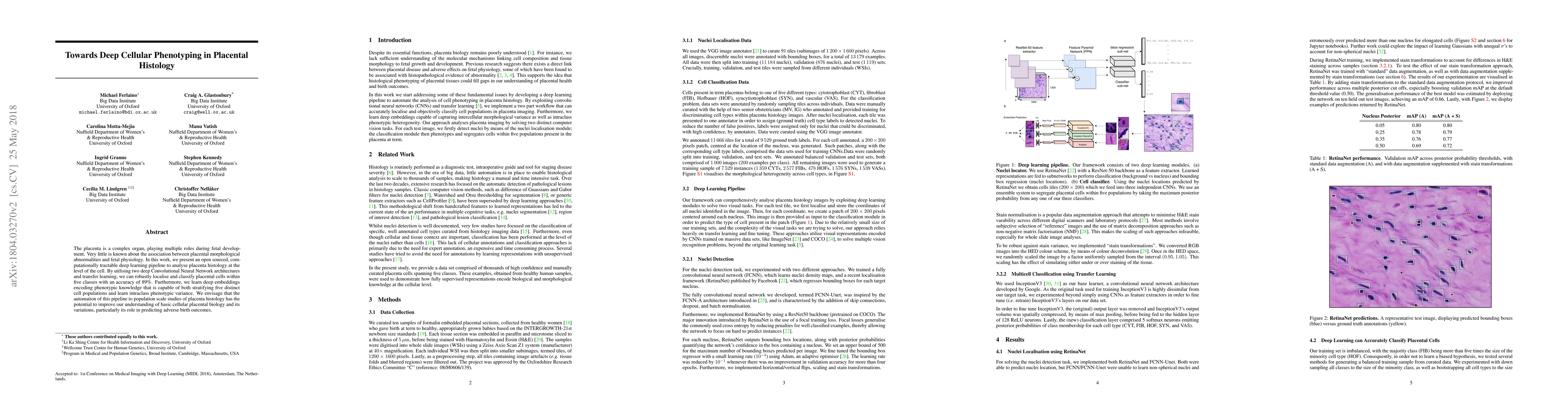 The placenta is a complex organ, playing multiple roles during fetal development. Very little is known about the association between placental morphological abnormalities and fetal physiology. In this work, we present an open sourced, computationally tractable deep learning pipeline to analyse placenta histology at the level of the cell. By utilising two deep Convolutional Neural Network architectures and transfer learning, we can robustly localise and classify placental cells within five classes with an accuracy of 89%. Furthermore, we learn deep embeddings encoding phenotypic knowledge that is capable of both stratifying five distinct cell populations and learn intraclass phenotypic variance. We envisage that the automation of this pipeline to population scale studies of placenta histology has the potential to improve our understanding of basic cellular placental biology and its variations, particularly its role in predicting adverse birth outcomes.