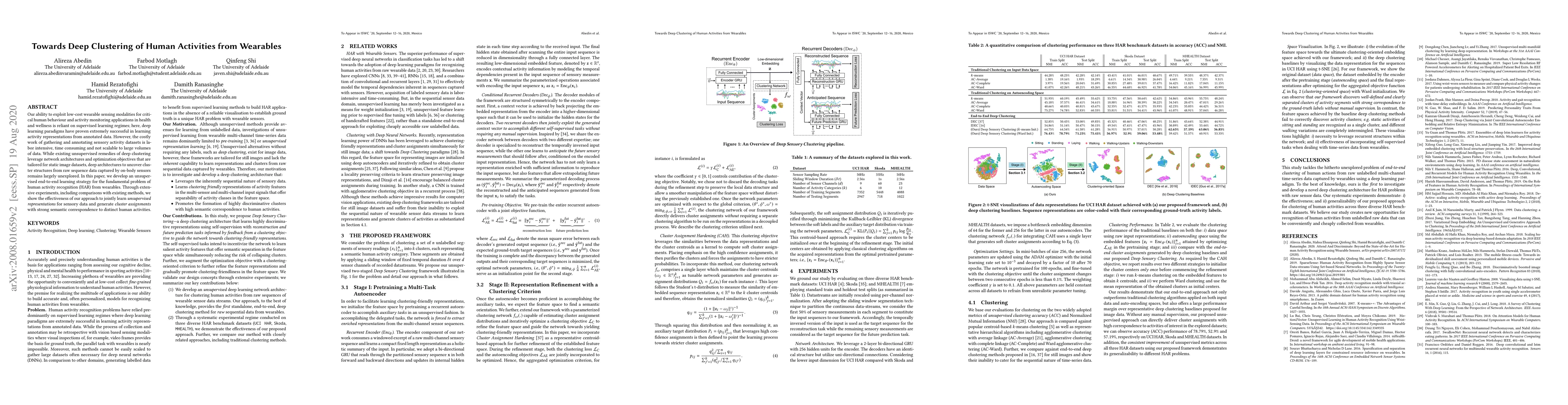 Our ability to exploit low-cost wearable sensing modalities for critical human behaviour and activity monitoring applications in health and wellness is reliant on supervised learning regimes; here, deep learning paradigms have proven extremely successful in learning activity representations from annotated data. However, the costly work of gathering and annotating sensory activity datasets is labor-intensive, time consuming and not scalable to large volumes of data. While existing unsupervised remedies of deep clustering leverage network architectures and optimization objectives that are tailored for static image datasets, deep architectures to uncover cluster structures from raw sequence data captured by on-body sensors remains largely unexplored. In this paper, we develop an unsupervised end-to-end learning strategy for the fundamental problem of human activity recognition (HAR) from wearables. Through extensive experiments, including comparisons with existing methods, we show the effectiveness of our approach to jointly learn unsupervised representations for sensory data and generate cluster assignments with strong semantic correspondence to distinct human activities.