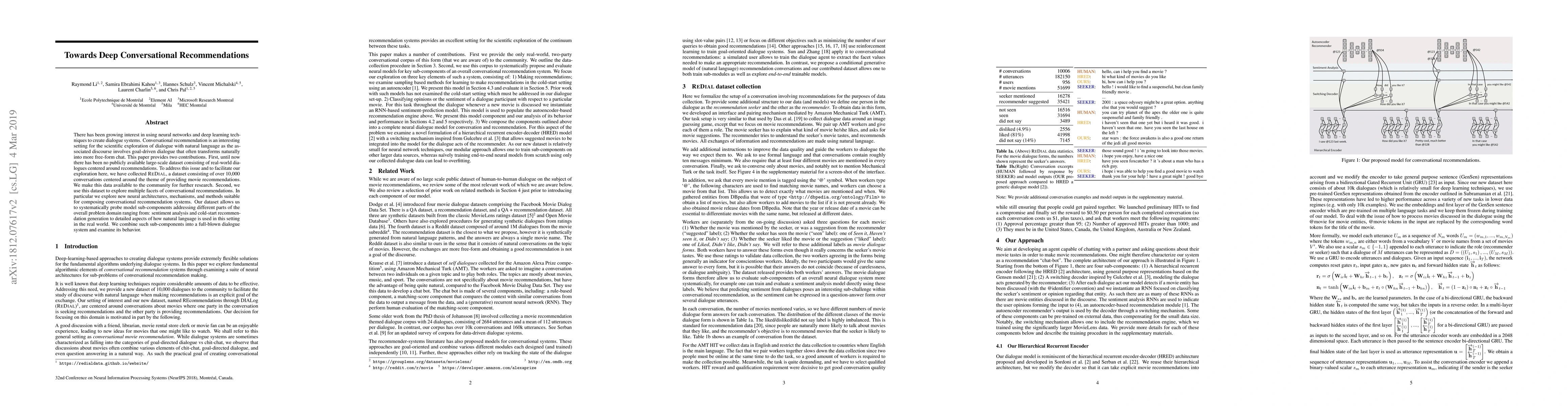 Researchers created a large dataset of real-world conversations about movie recommendations to improve conversational recommendation systems. They explored new neural architectures and methods, achieving better dialogue systems with improved sentiment analysis and cold-start recommendation generation.