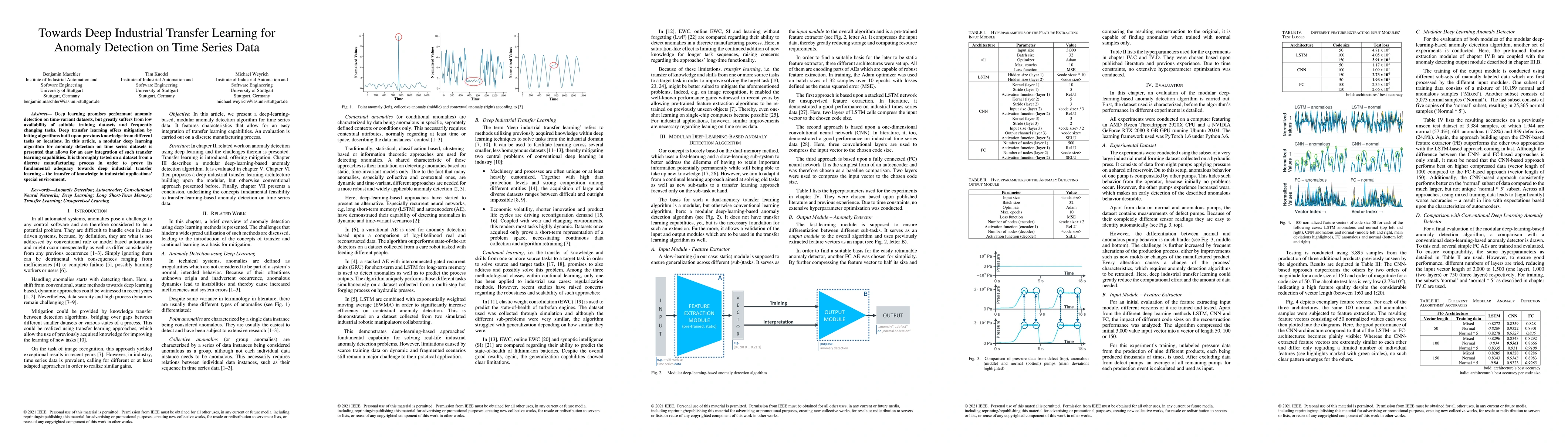 Deep learning promises performant anomaly detection on time-variant datasets, but greatly suffers from low availability of suitable training datasets and frequently changing tasks. Deep transfer learning offers mitigation by letting algorithms built upon previous knowledge from different tasks or locations. In this article, a modular deep learning algorithm for anomaly detection on time series datasets is presented that allows for an easy integration of such transfer learning capabilities. It is thoroughly tested on a dataset from a discrete manufacturing process in order to prove its fundamental adequacy towards deep industrial transfer learning - the transfer of knowledge in industrial applications' special environment.