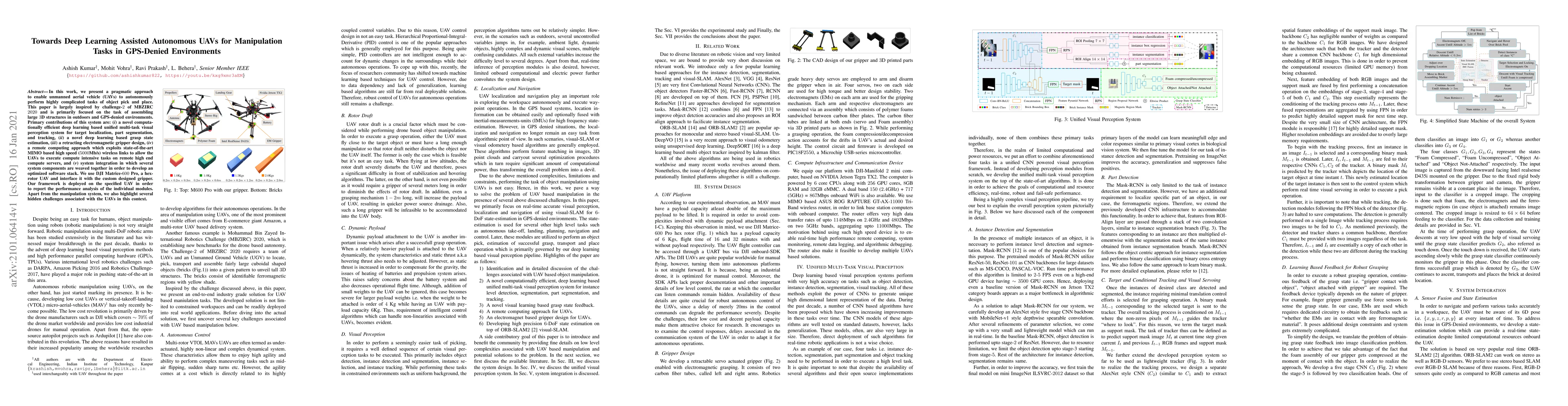 In this work, we present a pragmatic approach to enable unmanned aerial vehicle (UAVs) to autonomously perform highly complicated tasks of object pick and place. This paper is largely inspired by challenge-2 of MBZIRC 2020 and is primarily focused on the task of assembling large 3D structures in outdoors and GPS-denied environments. Primary contributions of this system are: (i) a novel computationally efficient deep learning based unified multi-task visual perception system for target localization, part segmentation, and tracking, (ii) a novel deep learning based grasp state estimation, (iii) a retracting electromagnetic gripper design, (iv) a remote computing approach which exploits state-of-the-art MIMO based high speed (5000Mb/s) wireless links to allow the UAVs to execute compute intensive tasks on remote high end compute servers, and (v) system integration in which several system components are weaved together in order to develop an optimized software stack. We use DJI Matrice-600 Pro, a hex-rotor UAV and interface it with the custom designed gripper. Our framework is deployed on the specified UAV in order to report the performance analysis of the individual modules. Apart from the manipulation system, we also highlight several hidden challenges associated with the UAVs in this context.