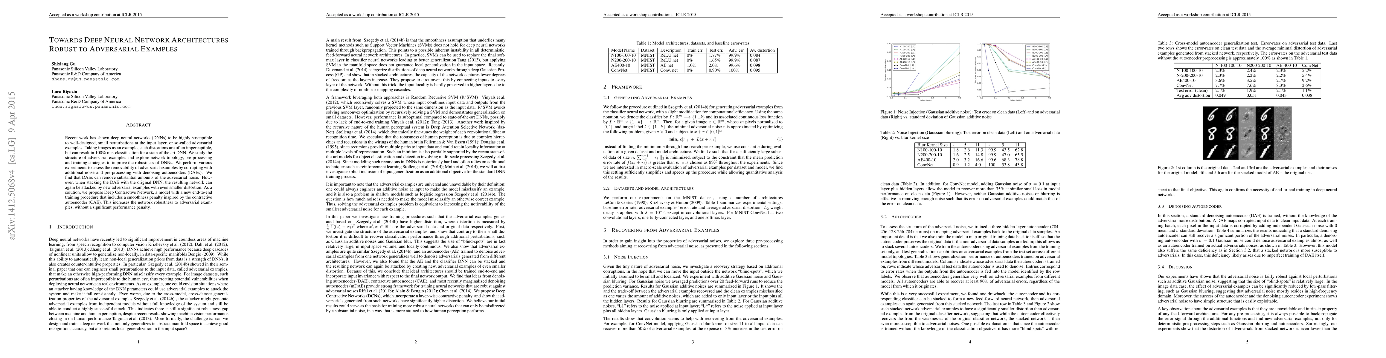 Recent work has shown deep neural networks (DNNs) to be highly susceptible to well-designed, small perturbations at the input layer, or so-called adversarial examples. Taking images as an example, such distortions are often imperceptible, but can result in 100% mis-classification for a state of the art DNN. We study the structure of adversarial examples and explore network topology, pre-processing and training strategies to improve the robustness of DNNs. We perform various experiments to assess the removability of adversarial examples by corrupting with additional noise and pre-processing with denoising autoencoders (DAEs). We find that DAEs can remove substantial amounts of the adversarial noise. How- ever, when stacking the DAE with the original DNN, the resulting network can again be attacked by new adversarial examples with even smaller distortion. As a solution, we propose Deep Contractive Network, a model with a new end-to-end training procedure that includes a smoothness penalty inspired by the contractive autoencoder (CAE). This increases the network robustness to adversarial examples, without a significant performance penalty.
