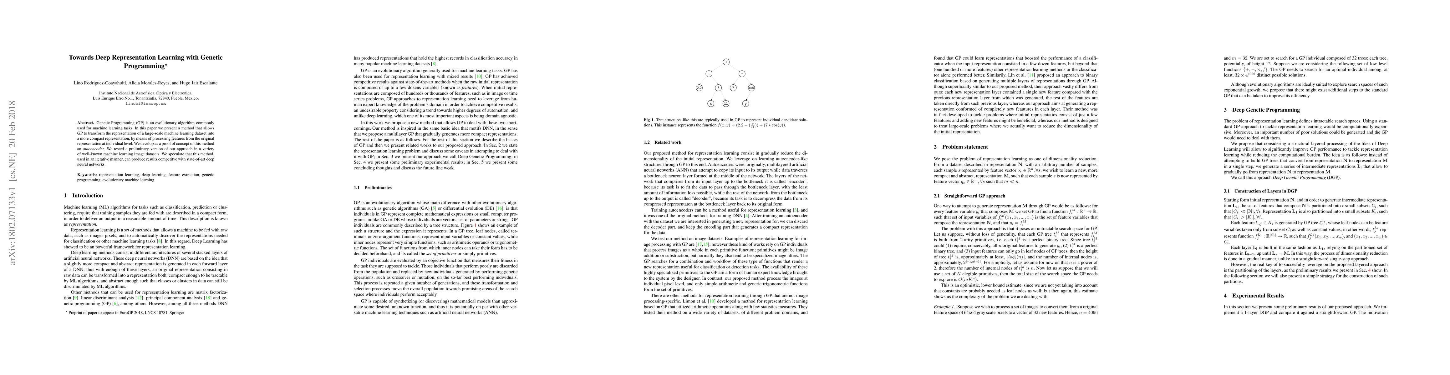 This paper proposes a method using Genetic Programming to create compact representations from large-scale machine learning datasets through individual feature processing, demonstrating this with an autoencoder on image datasets, and suggests potential for competitive results with state-of-the-art deep neural networks when used iteratively.