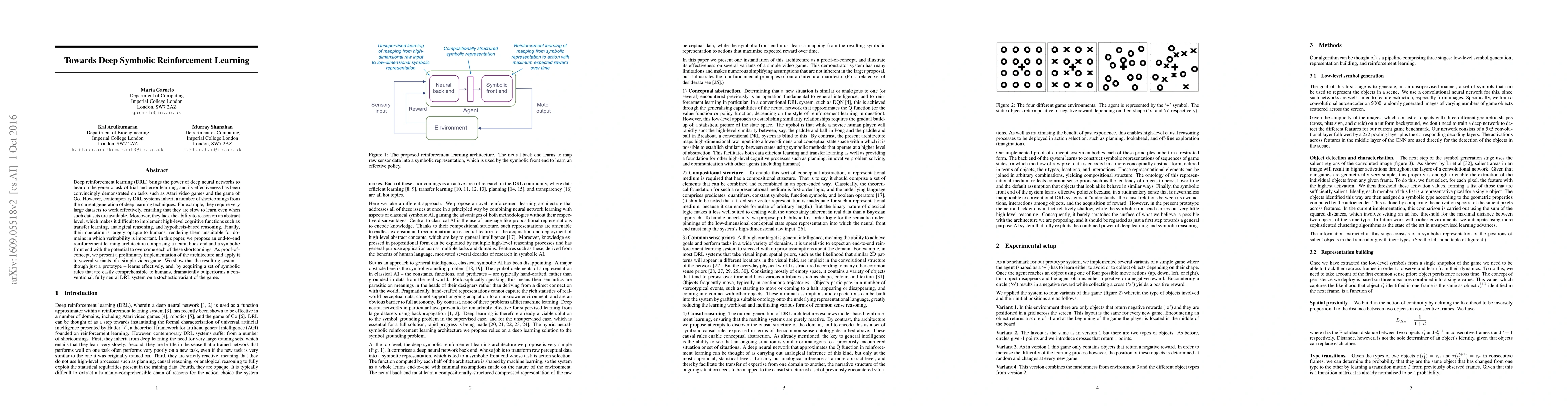 This paper proposes a hybrid deep symbolic reinforcement learning architecture that aims to address the limitations of conventional deep reinforcement learning, such as large dataset dependency, lack of abstract reasoning, and lack of transparency. The proposed system combines a neural network with a symbolic front end, demonstrating improved performance and human-comprehensible learning in a simple video game.