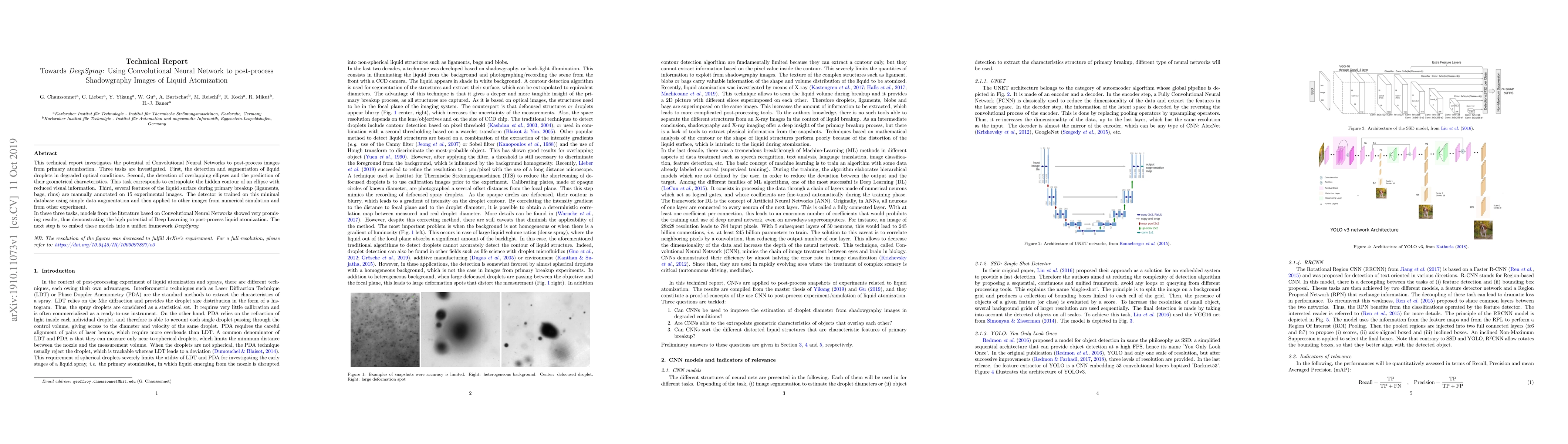 This technical report investigates the potential of Convolutional Neural Networks to post-process images from primary atomization. Three tasks are investigated. First, the detection and segmentation of liquid droplets in degraded optical conditions. Second, the detection of overlapping ellipses and the prediction of their geometrical characteristics. This task corresponds to extrapolate the hidden contour of an ellipse with reduced visual information. Third, several features of the liquid surface during primary breakup (ligaments, bags, rims) are manually annotated on 15 experimental images. The detector is trained on this minimal database using simple data augmentation and then applied to other images from numerical simulation and from other experiment. In these three tasks, models from the literature based on Convolutional Neural Networks showed very promising results, thus demonstrating the high potential of Deep Learning to post-process liquid atomization. The next step is to embed these models into a unified framework DeepSpray.