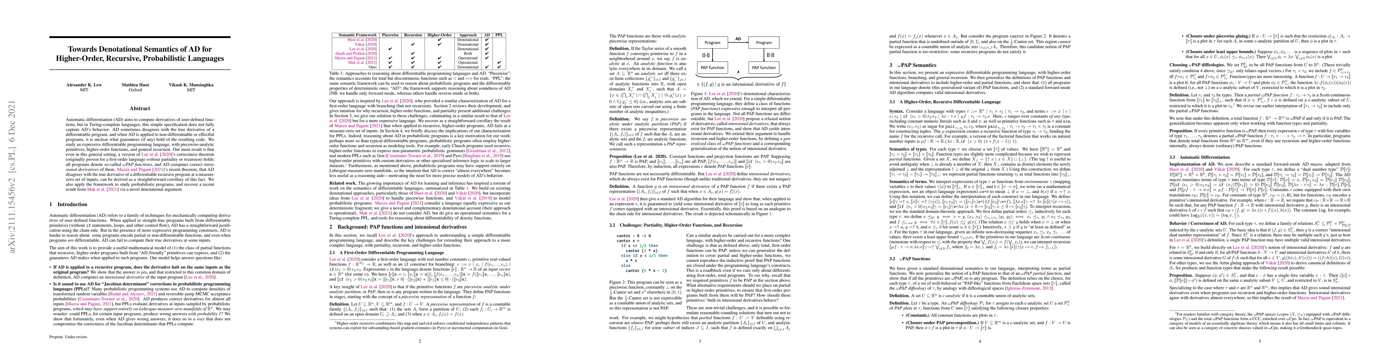 Automatic differentiation (AD) aims to compute derivatives of user-defined functions, but in Turing-complete languages, this simple specification does not fully capture AD's behavior: AD sometimes disagrees with the true derivative of a differentiable program, and when AD is applied to non-differentiable or effectful programs, it is unclear what guarantees (if any) hold of the resulting code. We study an expressive differentiable programming language, with piecewise-analytic primitives, higher-order functions, and general recursion. Our main result is that even in this general setting, a version of Lee et al. [2020]'s correctness theorem (originally proven for a first-order language without partiality or recursion) holds: all programs denote so-called $\omega$PAP functions, and AD computes correct intensional derivatives of them. Mazza and Pagani [2021]'s recent theorem, that AD disagrees with the true derivative of a differentiable recursive program at a measure-zero set of inputs, can be derived as a straightforward corollary of this fact. We also apply the framework to study probabilistic programs, and recover a recent result from Mak et al. [2021] via a novel denotational argument.