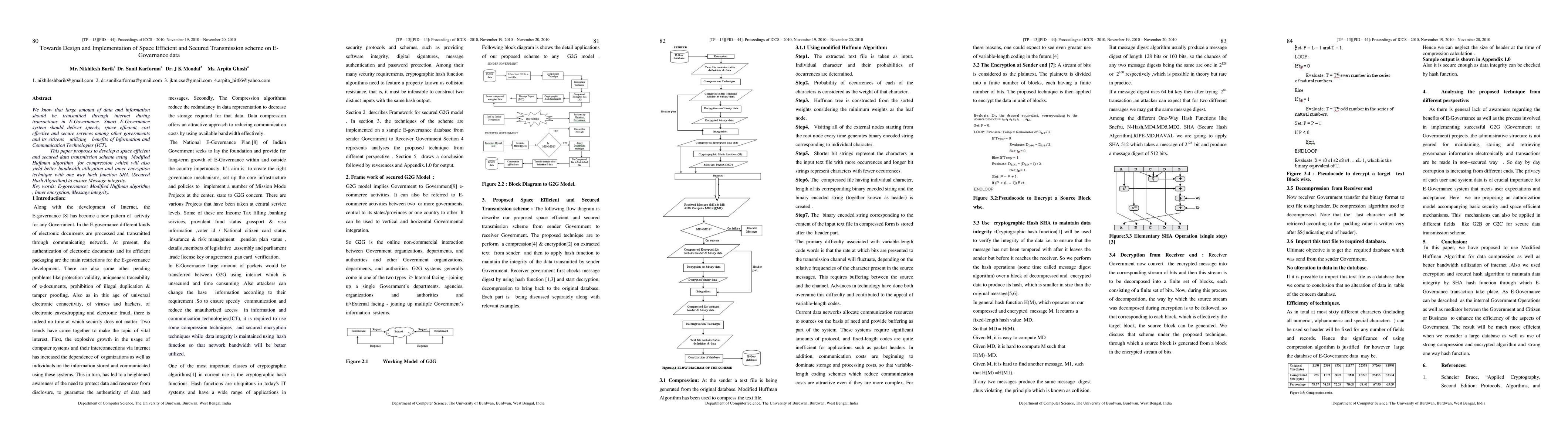 This paper proposes a space efficient and secure data transmission scheme for E-Governance using a Modified Huffman algorithm for compression and SHA (Secured Hash Algorithm) for encryption to ensure message integrity and better bandwidth utilization.