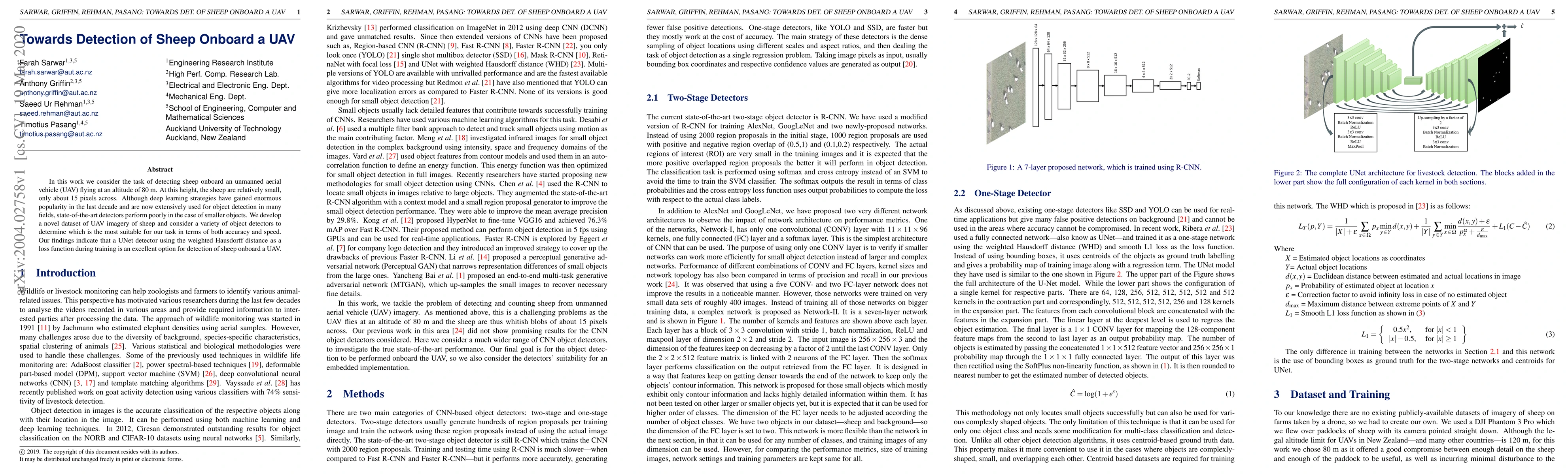 This research focuses on detecting small sheep in UAV images at 80m altitude. The study finds that a UNet detector with a weighted Hausdorff distance loss function provides high accuracy and speed for this task, outperforming other tested methods.